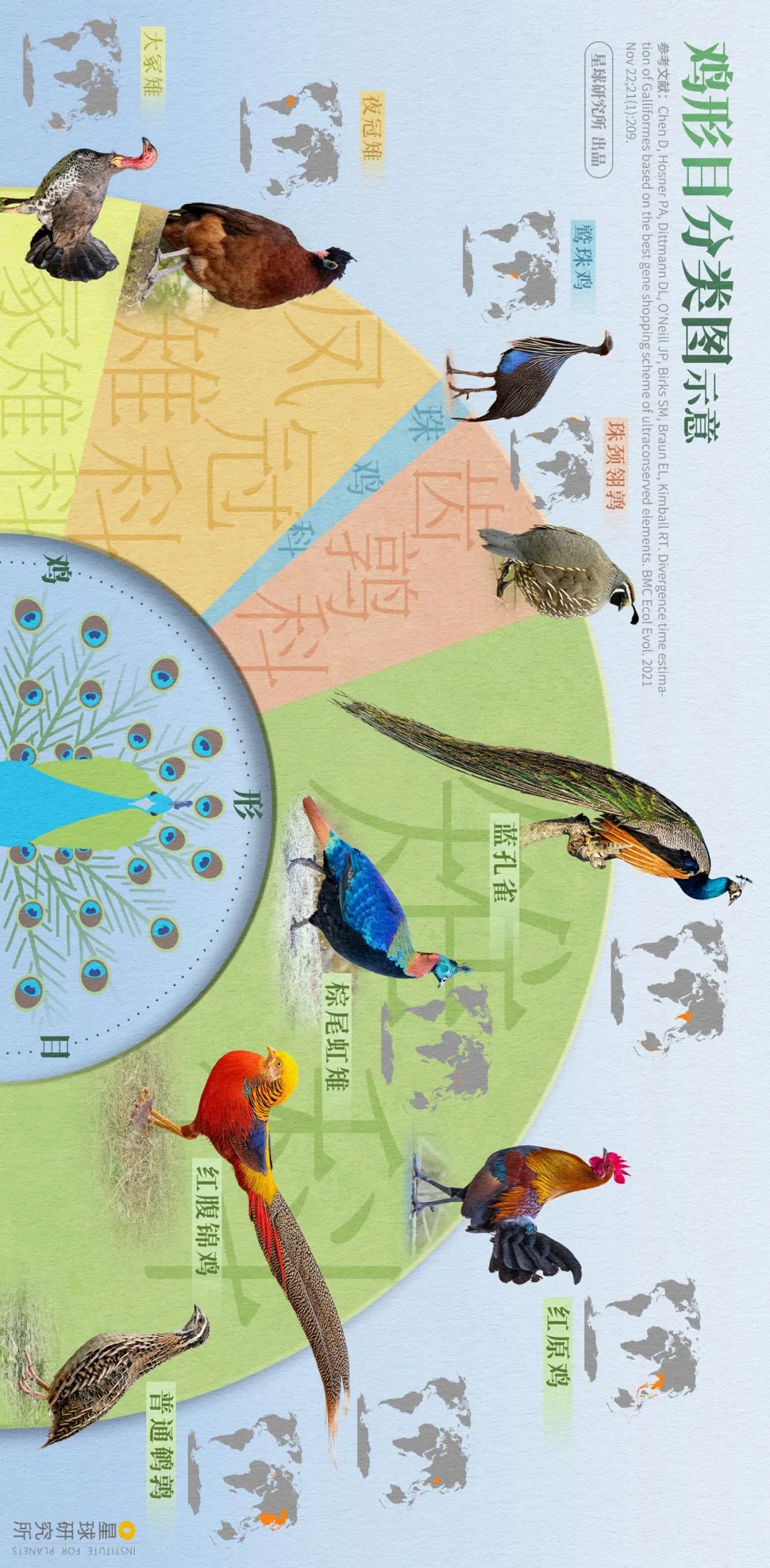 (请横屏观看,鸡形目共有5科295种,分别为:冢雉科、凤冠雉科、珠鸡科、齿鹑科和雉科,其中雉科占180种,是鸡形目中最大的科,图片来源@视觉中国、alamy、李艳霞、山风、赵永清、刘璐、卢鸣浪,制图@汉青、陈志浩)