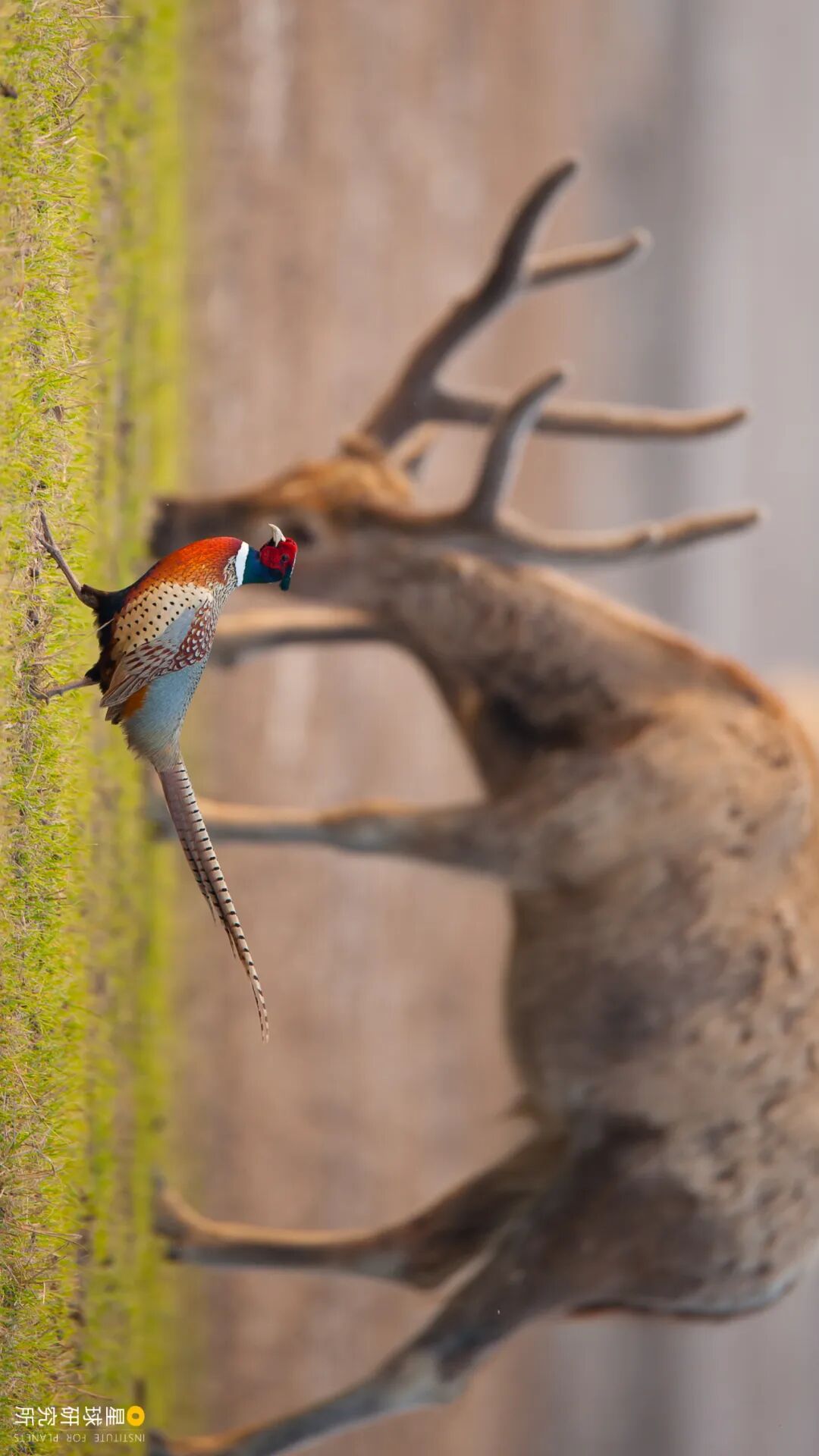 (请横屏观看,雄鹿与雄雉鸡,虽然是两个物种,但在追逐爱情方面是一样的,摄影师@孙华金)