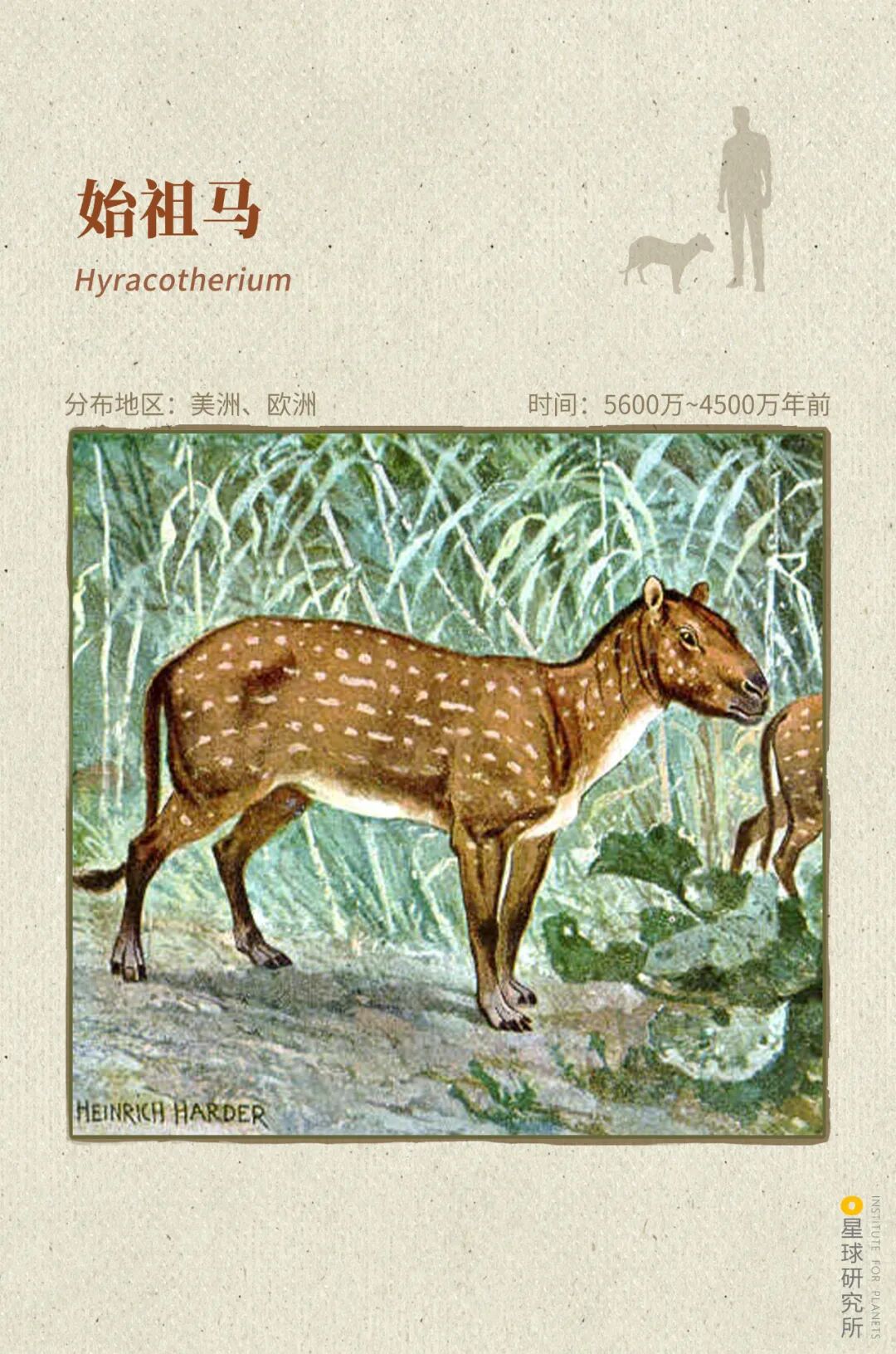 (始祖马主要起源于北美洲[欧洲也曾发现始祖马化石],是一种肩高仅30~60厘米的小型动物,它们前脚4趾,后脚3趾,是最原始的马类,制图@张琪/星球研究所,图片来源@wikimedia commons)