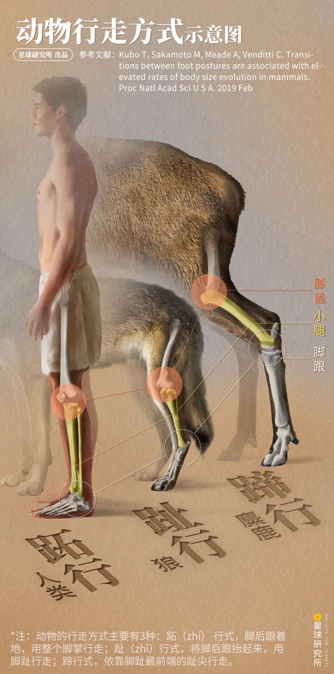 (跖[zhí]行式,代表动物有灵长类、熊和啮齿动物等;趾[zhǐ]行式,代表动物有鸟类、猫科、犬科动物等;蹄行式,代表动物有各种有蹄类,制图@张琪/星球研究所,图片来源@视觉中国)