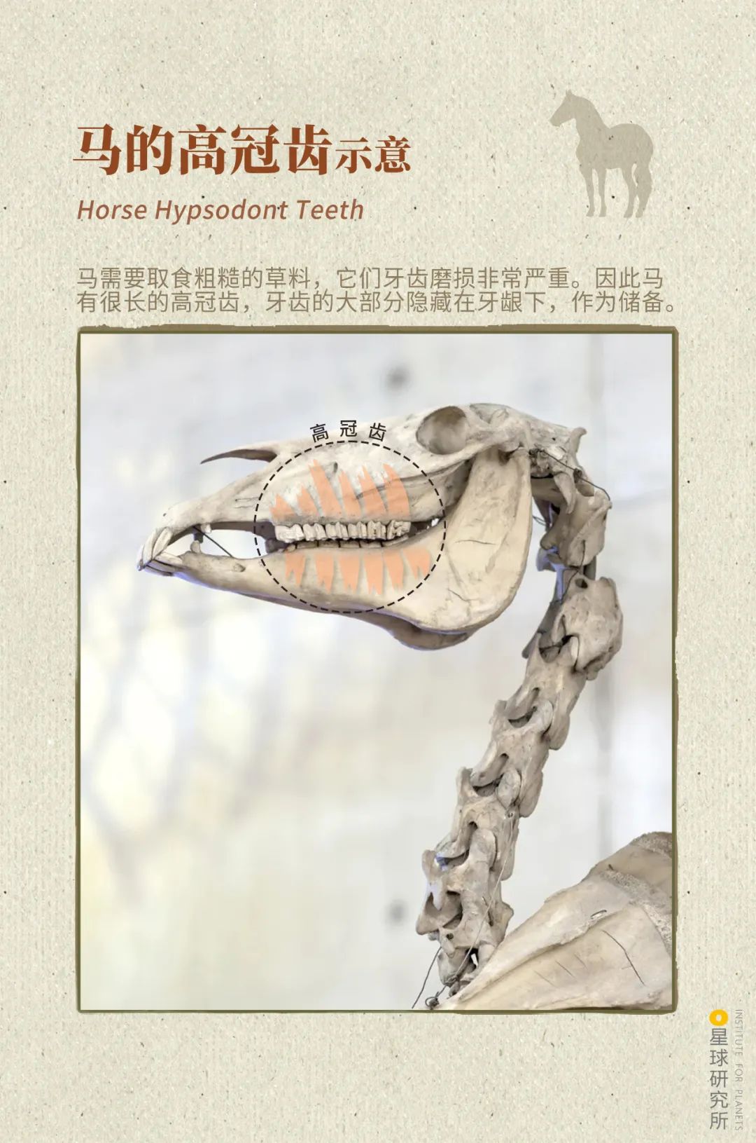 (马拥有很长的高冠齿,大部分牙齿隐藏在牙龈之下,一生中可以不断生长,来应对咀嚼食物带来的磨损,制图@张琪/星球研究所,图片来源@视觉中国)