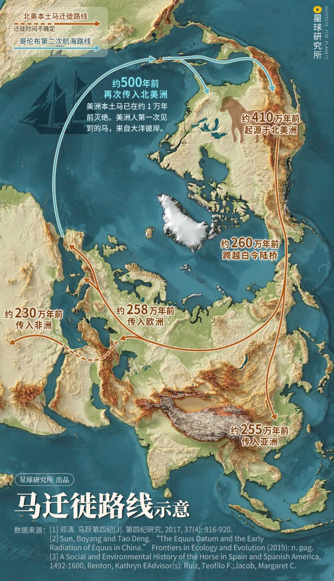 (距今约260万年前,在第四次大冰期的影响下,白令海峡海平面下降,形成陆桥,现代马的祖先通过白令海峡从北美洲向世界扩散,制图@陈景逸/星球研究所)