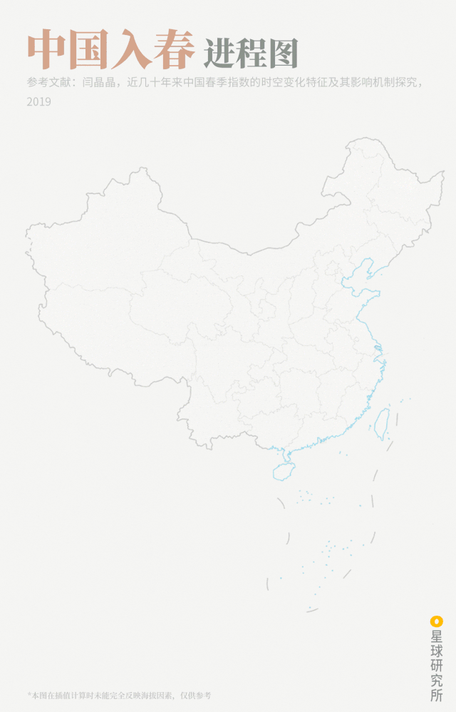 (中国入春进程图,为1951-2014年均值,制图@巩向杰&赵榜/星球研究所)
