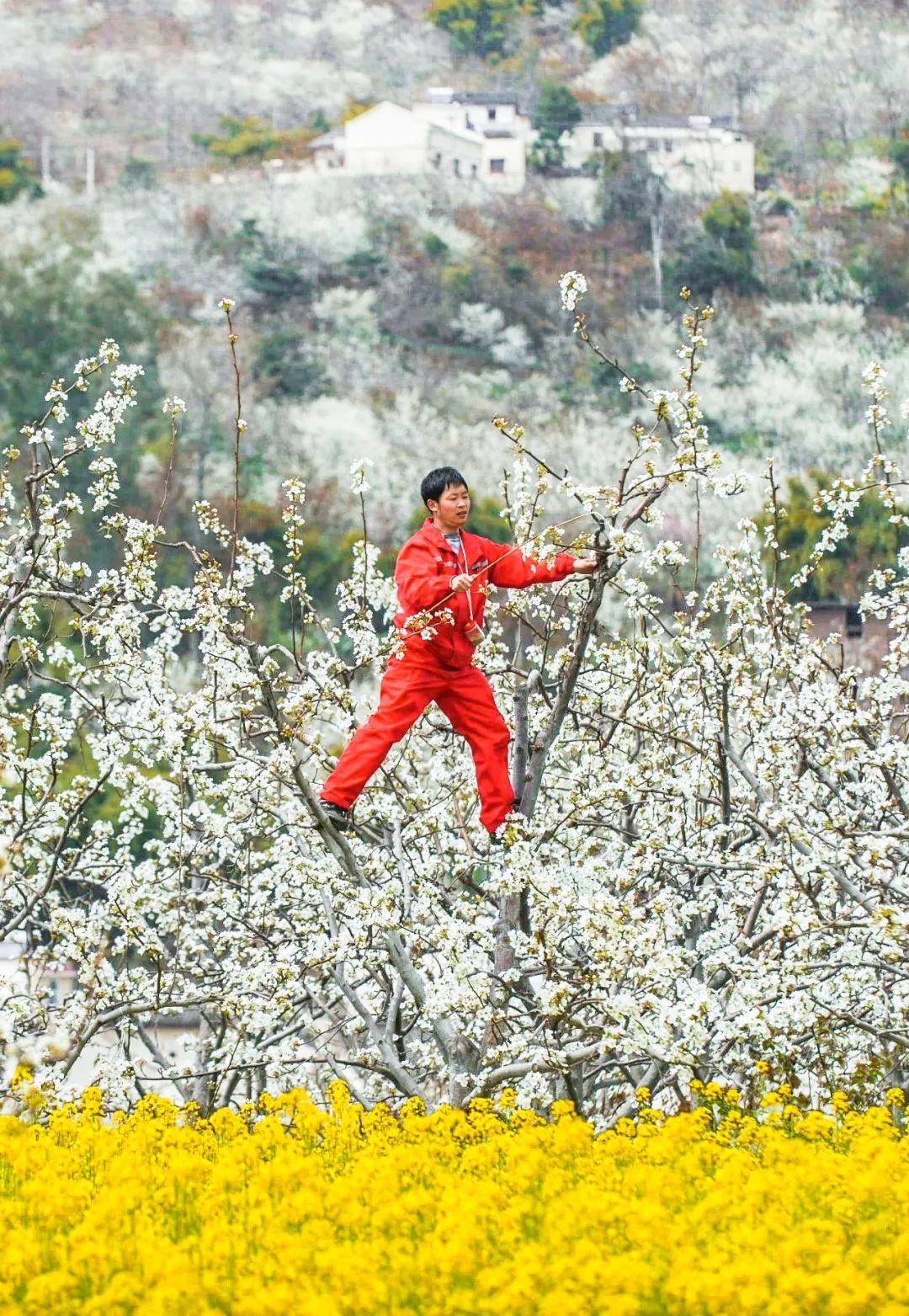 (四川雅安汉源县村民人工为梨花授粉,摄影师@杨涛)