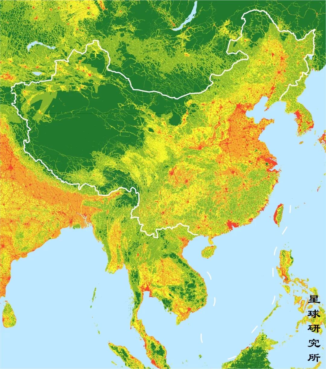 (中国人类足迹指数地图,通过城市建设、土地利用、道路分布、夜晚灯光等多个指标衡量人类对环境的影响,颜色越红表明影响越大,数据源自@国际野生生物保护学会The Wildlife Conservation Society, 制图@王朝阳/星球研究所)