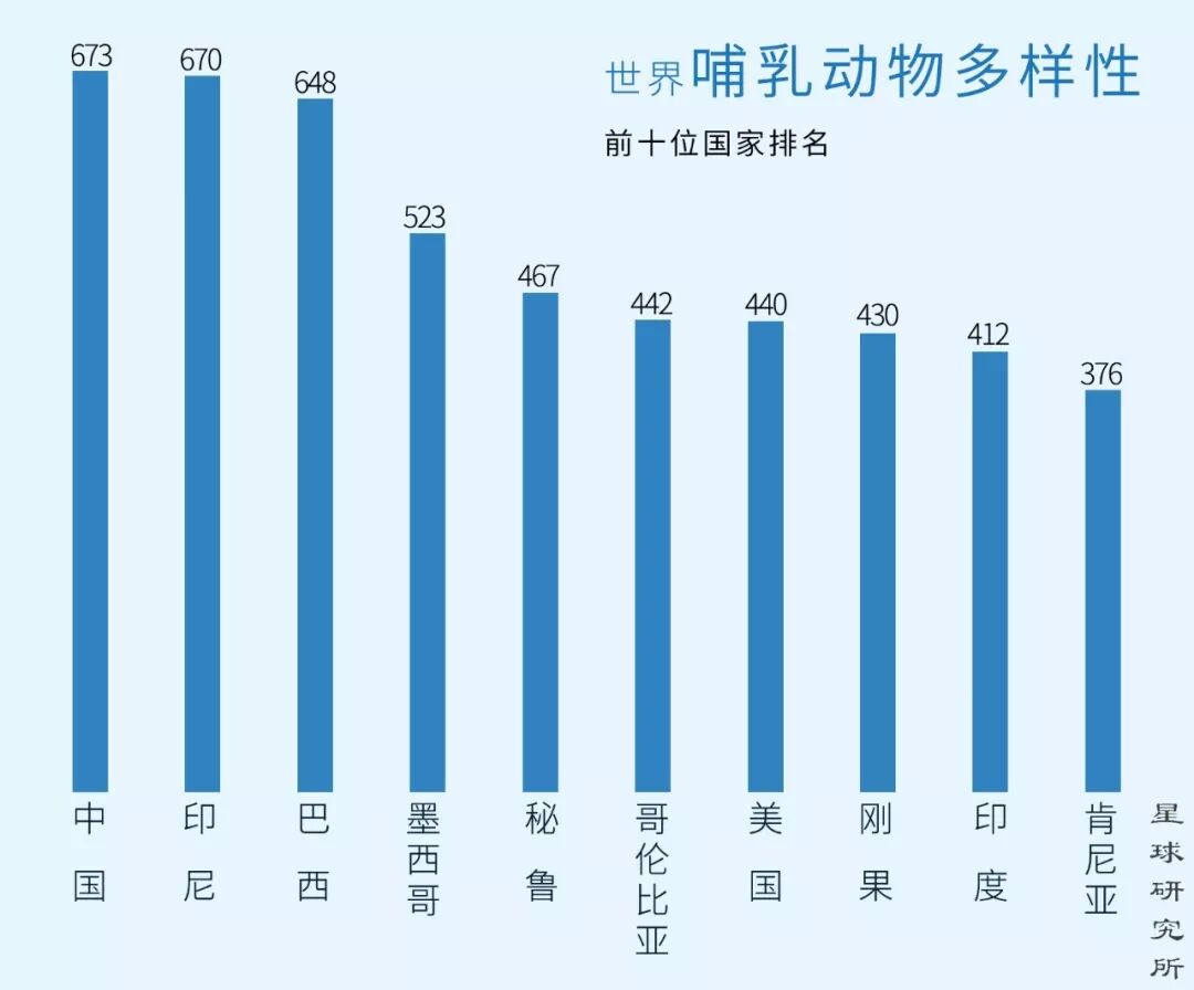 (世界哺乳动物多样性排名,数据源自@蒋志刚等《中国哺乳动物多样性》,2017年中国的哺乳动物种数更新为693种)