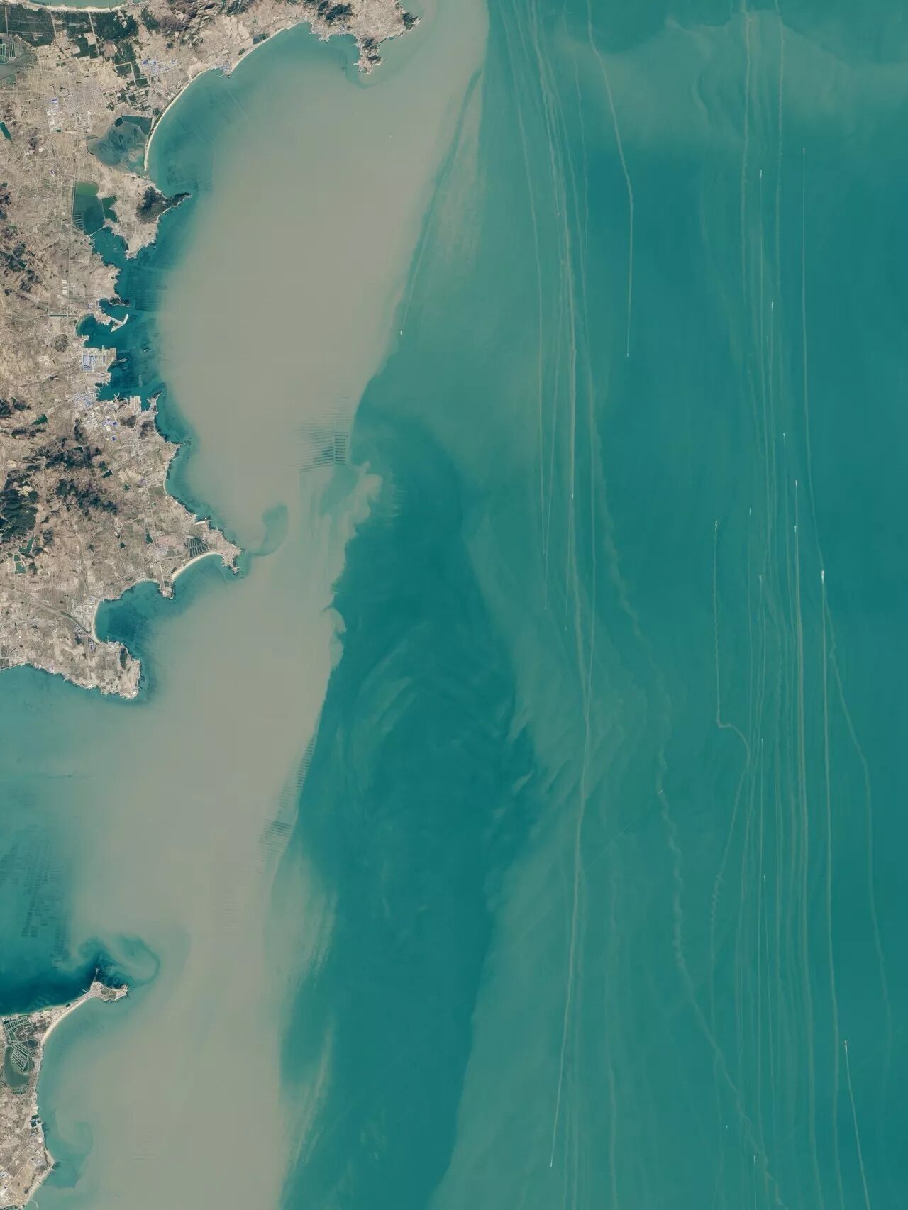 (山东半岛沿岸的航路,船只经过之处留下了一道道黄线,图片源自@NASA)