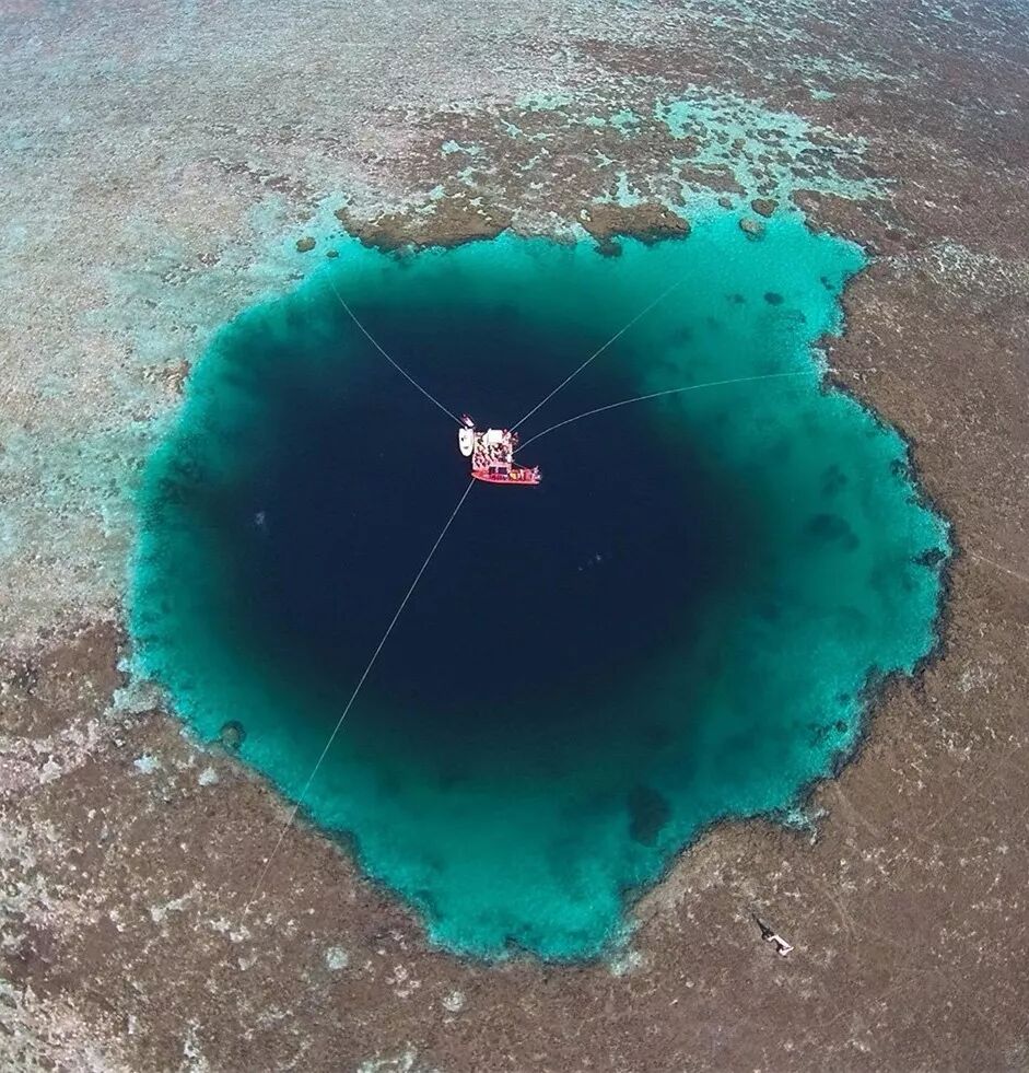 (2016年在南海探明的三沙永乐龙洞,其洞口直径130米,深度超过300米,是目前已知最深的蓝洞;从海面上看蓝洞呈现出与周边水域不同的深蓝色,上方为探测设备;摄影师@骆云飞)