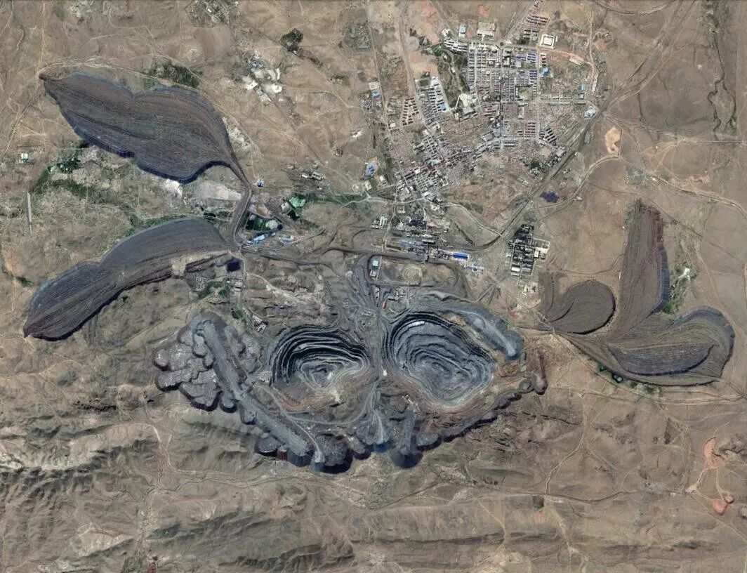 (内蒙古白云鄂博铁矿矿区在地表留下的疤痕,图片源自@Google地球)