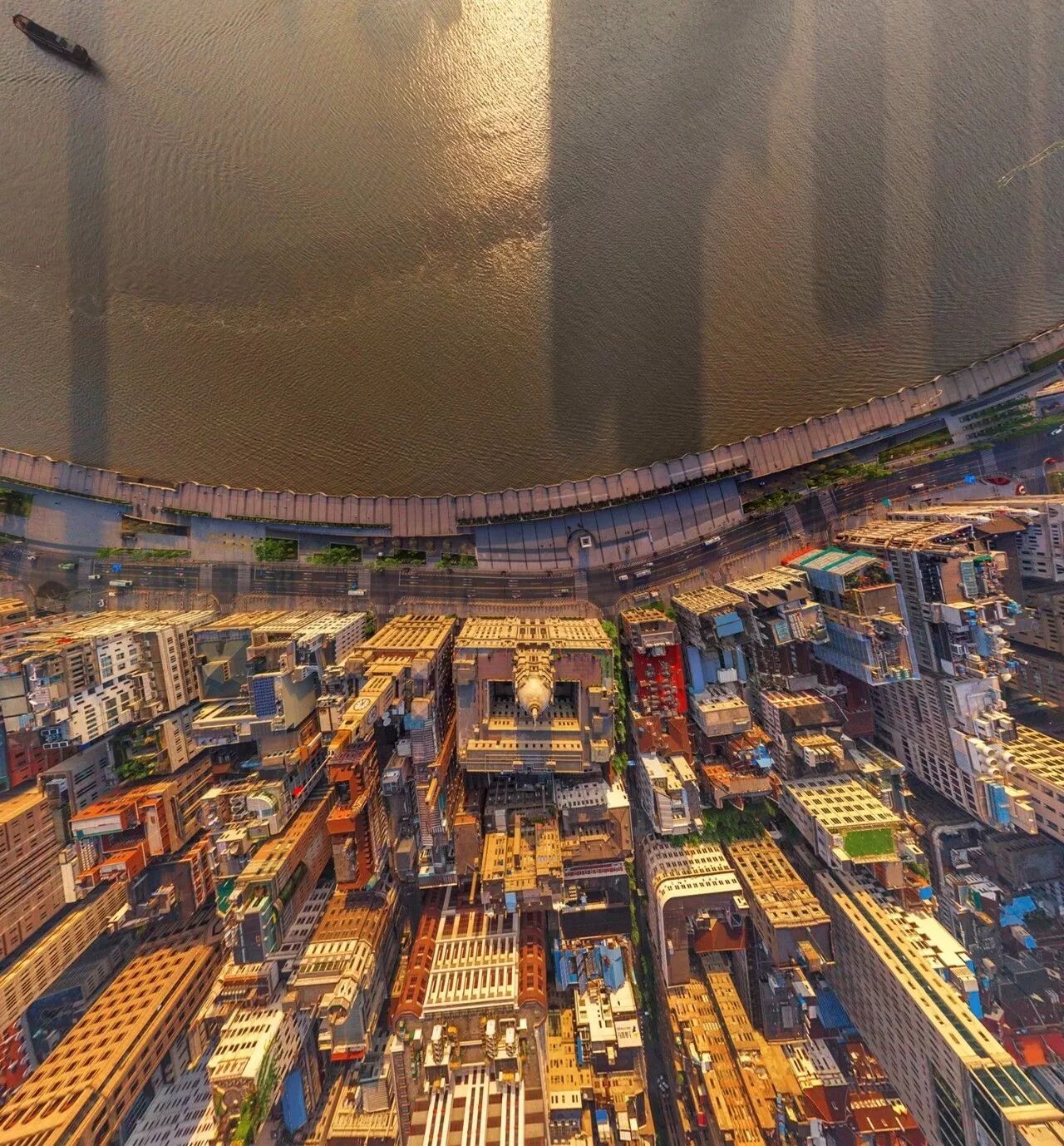 (上海外滩,画面中间为外滩12号,是近代中国的标志性建筑;因全景拼接,画面四周建筑物有拉伸变形,图片源自@AirPano)