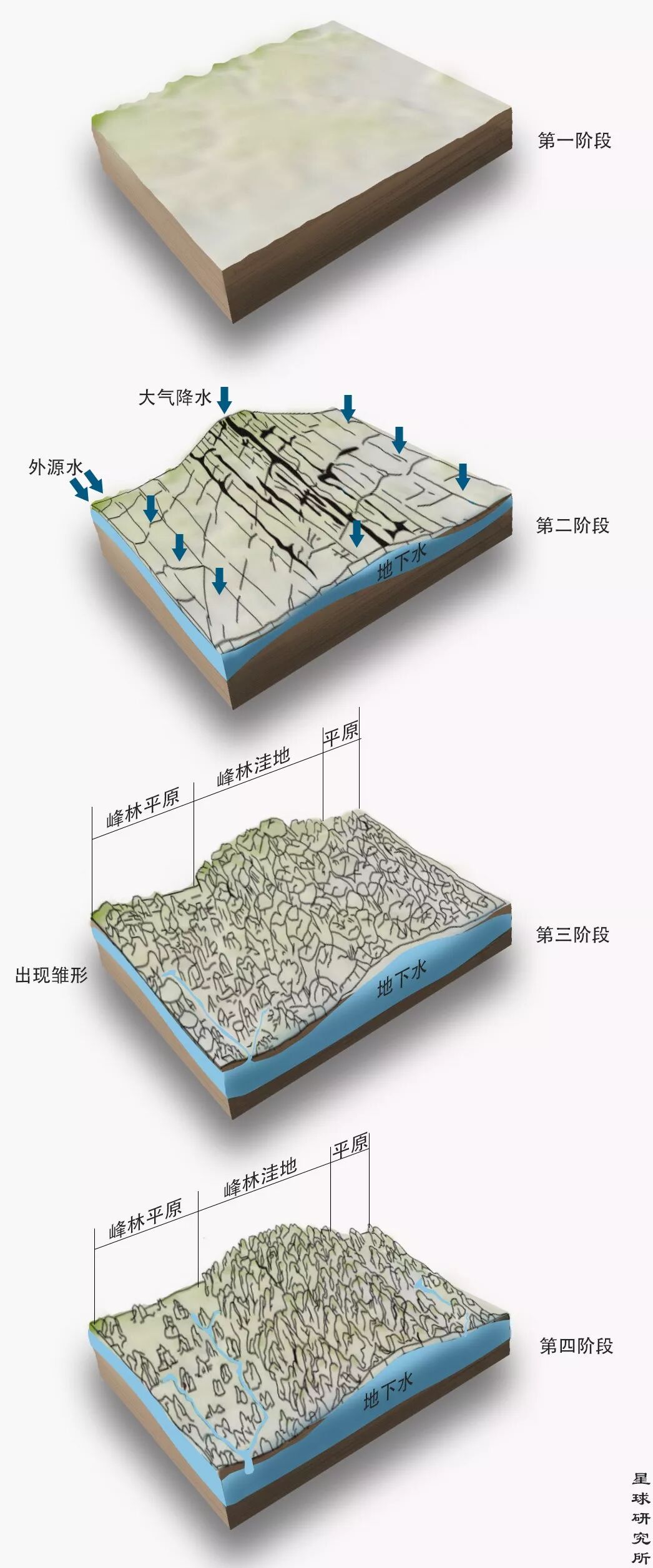 (喀斯特峰丛峰林地貌演化模式图,制图@刘昊冰/星球研究所,依据@朱学稳《桂林岩溶地貌与洞穴研究》)