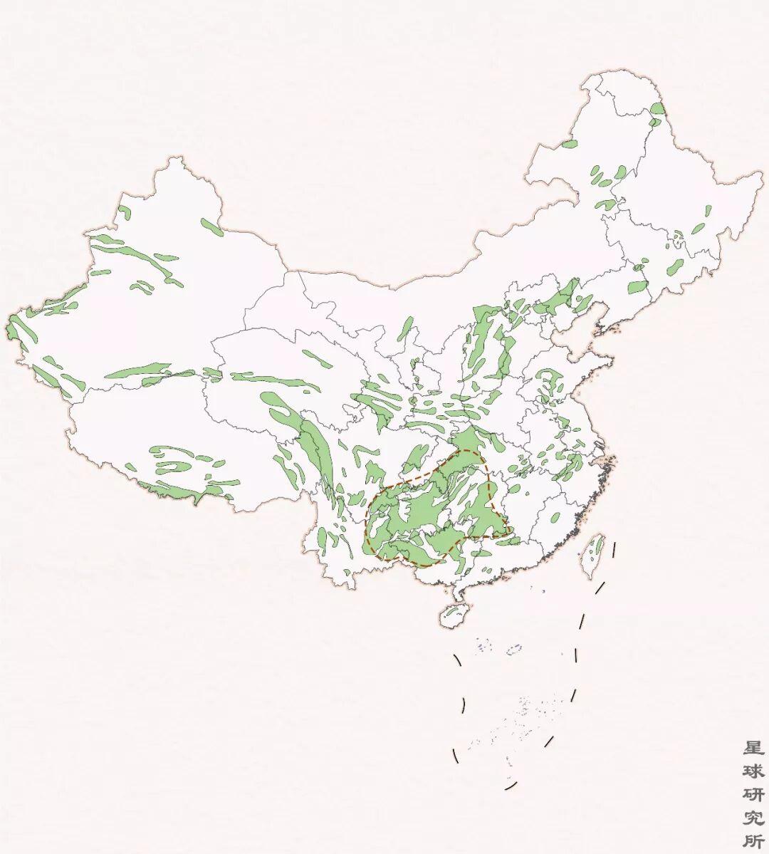 (中国碳酸盐岩分布图,碳酸盐岩是可溶性岩石最广泛的一种,红线内为喀斯特地貌密集区域,制图@刘昊冰/星球研究所,参考《中国自然地理图集》)