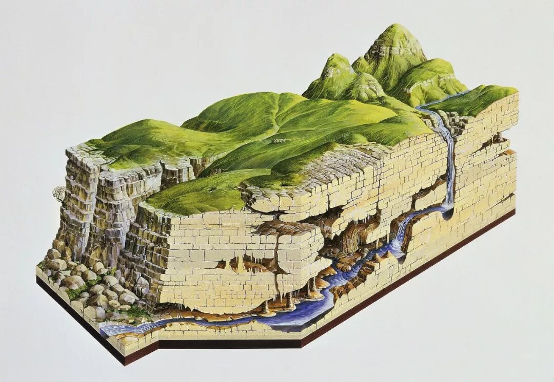 (部分喀斯特地貌形成示意图,又称岩溶地貌,图片源自@Vancouver Island University)
