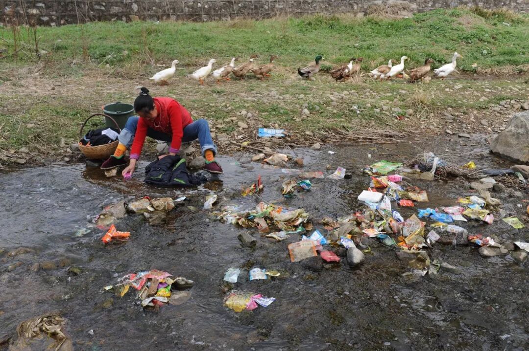 (秦岭商南县的村民在垃圾污染的河道里洗衣服,摄影师@李杰)