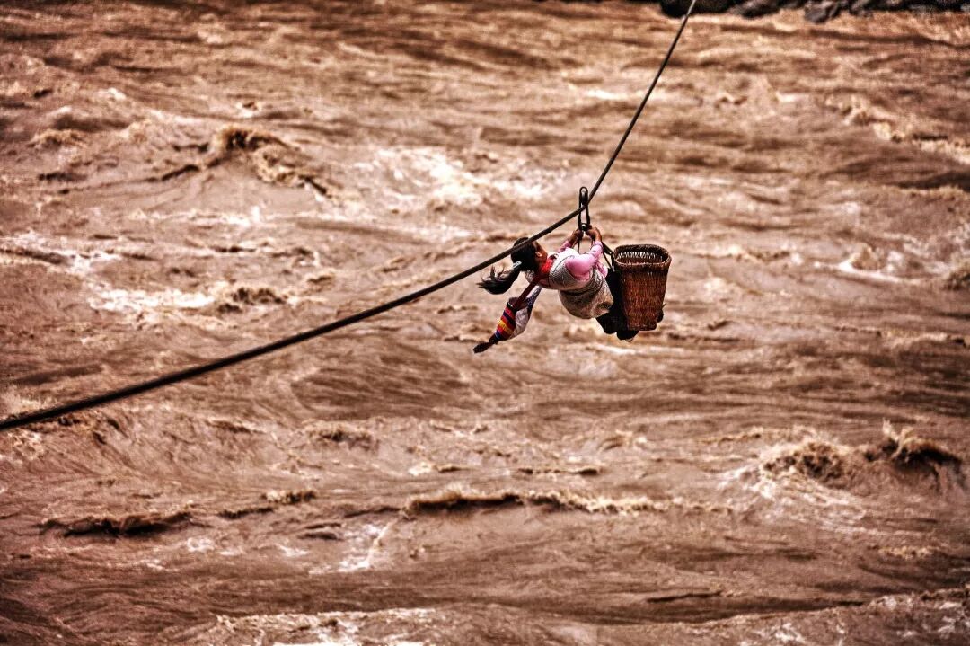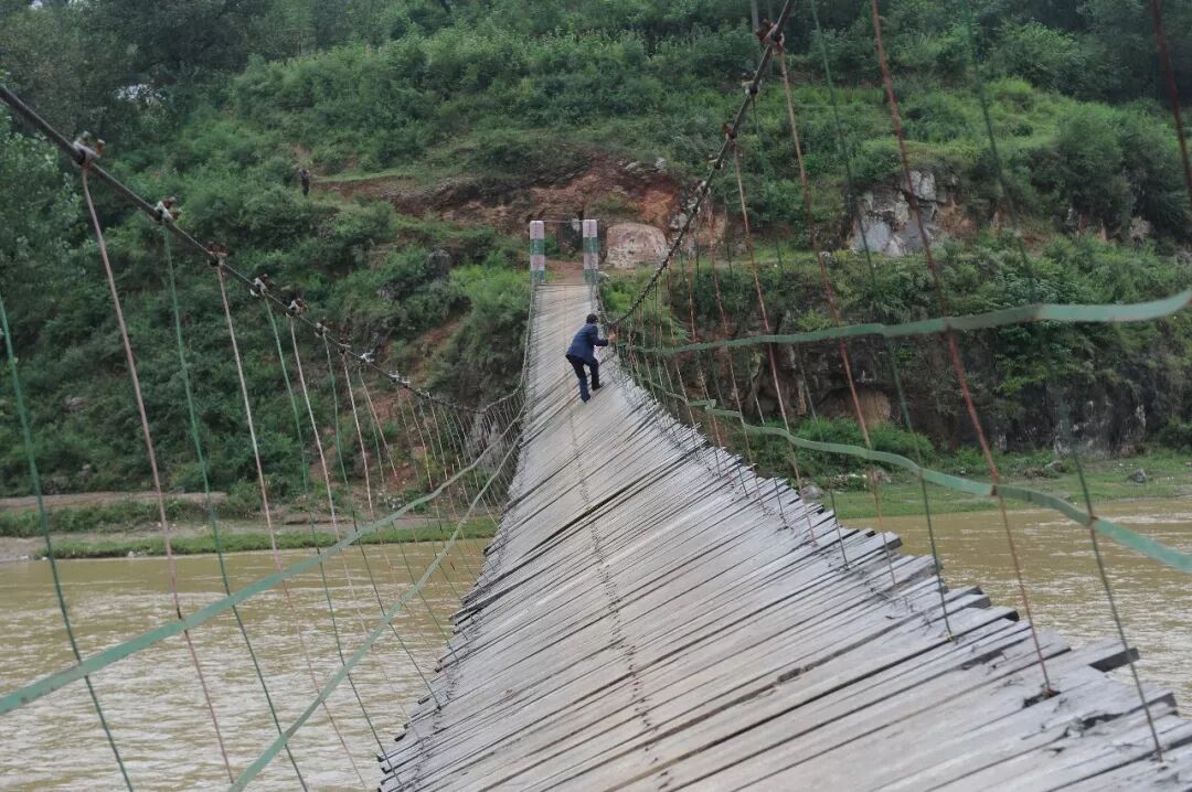 (2010年洛南县柏峪寺乡村民的出行桥被洪水冲断,只能冒险爬桥而过,因为他们无其他路可走,摄影师@李杰)