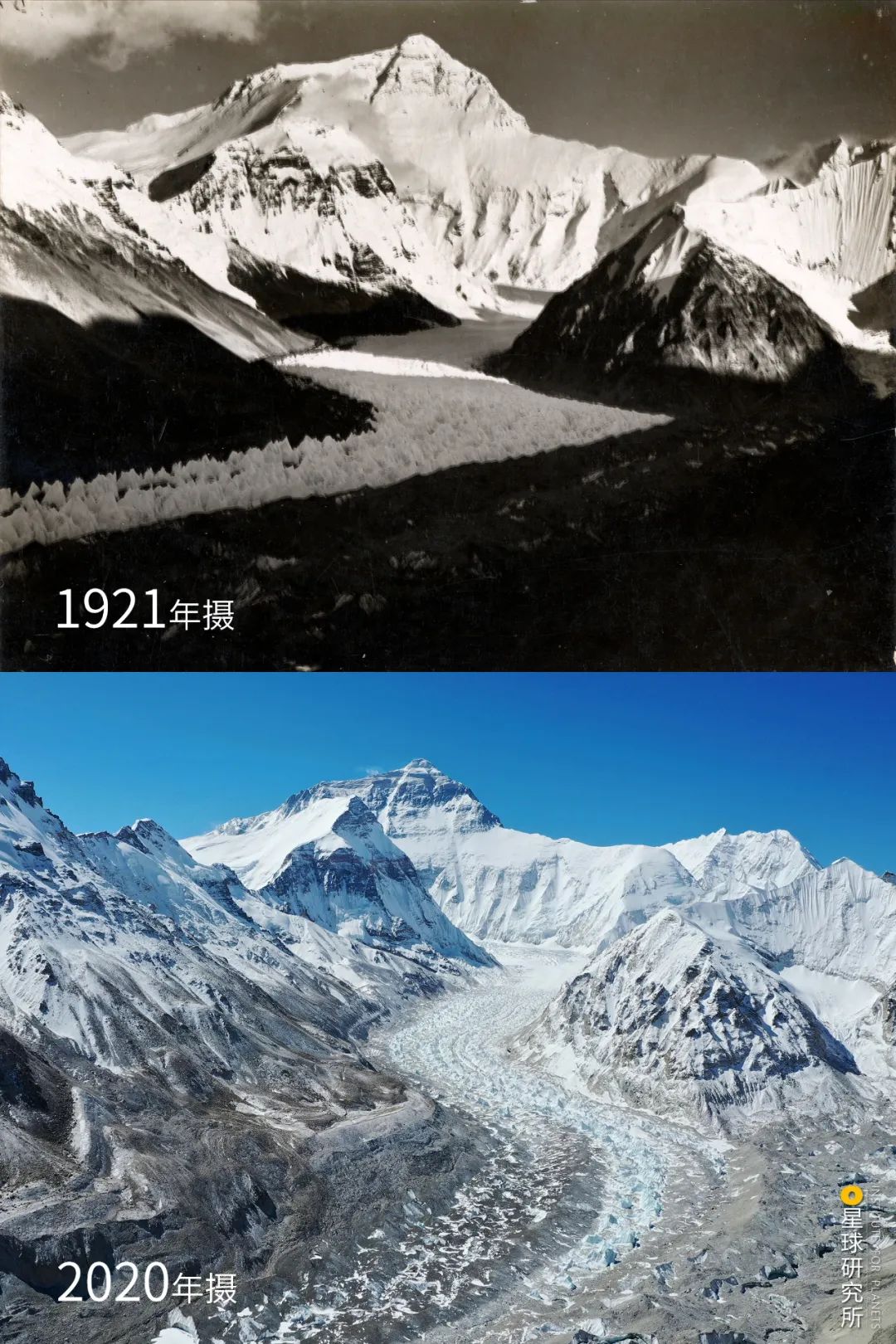 (珠穆朗玛峰北侧,中绒布冰川1921年与2020年对比图,可见冰川下的冰塔林有所退缩,摄影师@gettyimages&马春林)