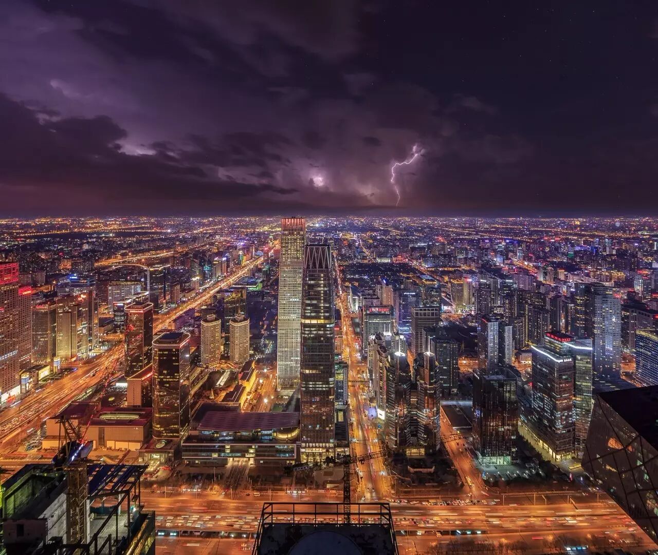 (拍摄于2017年5月下旬晚8点电闪雷鸣,拍摄于中国尊400余米的高度,摄影师@500PX虎步狼行)