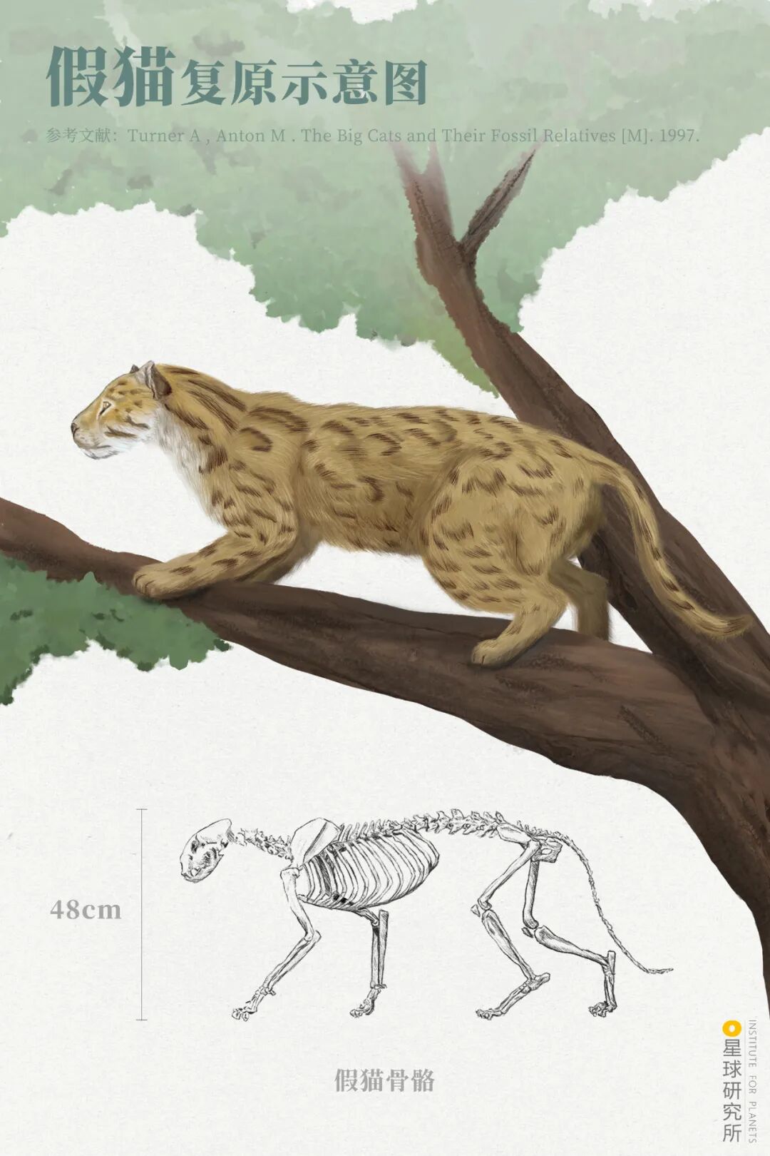 (假猫属物种生活于2000至800万年前之间的欧亚以及美洲大陆,根据化石记录,学界普遍认为它们是现生所有猫科(Felidae)动物的祖先,相比于现代的猫科动物,假猫具有“身长脚短”的形态特征,制图@杨宁/星球研究所)