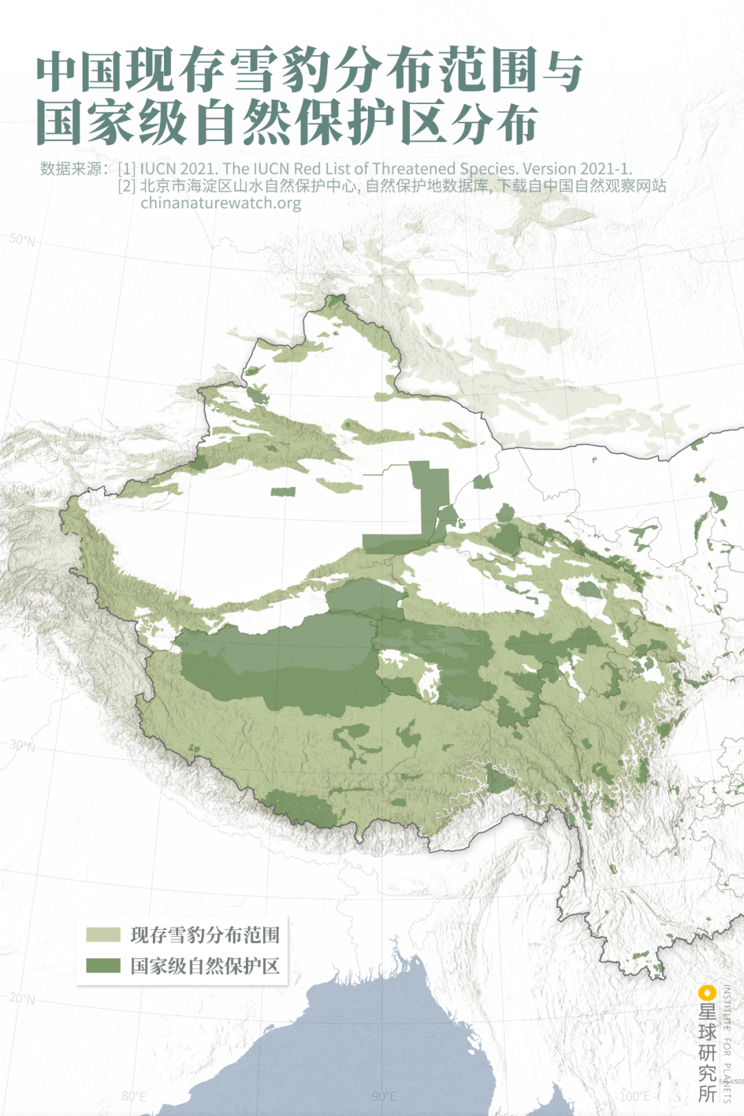 (目前中国雪豹分布区和国家级自然保护区的分布示意图,制图@郑艺/星球研究所)