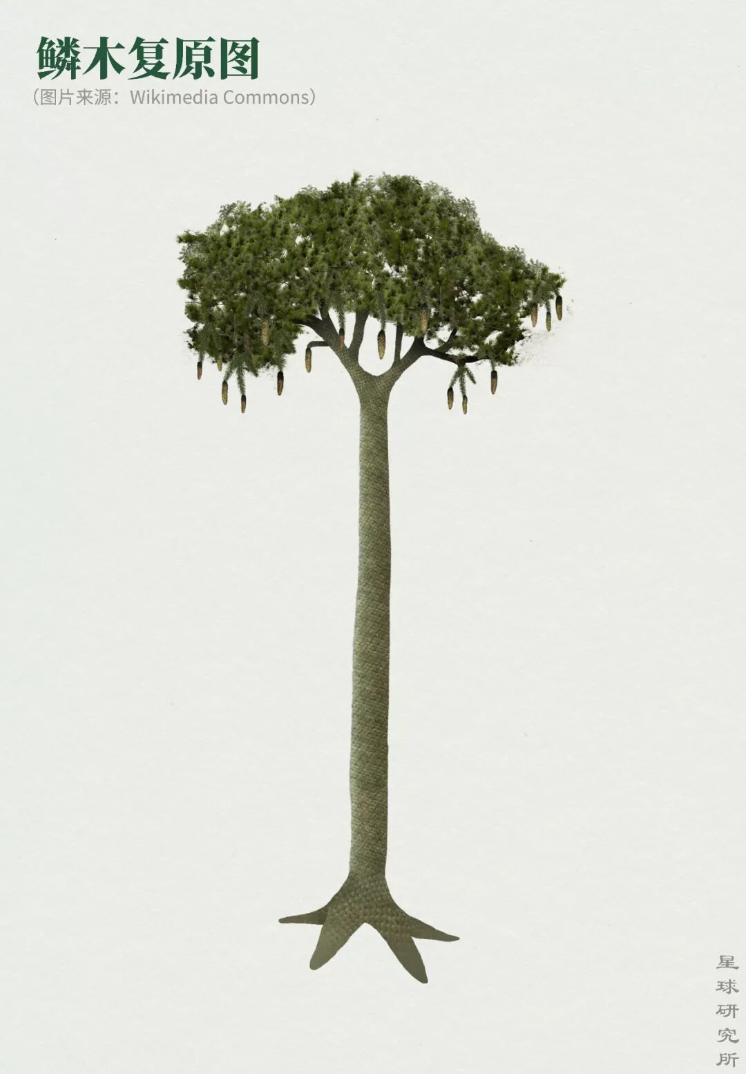 (一种石松植物:鳞木的复原图,表皮布满菱形或椭圆的纹路,图片来源@Wikimedia Commons,制图@郑伯容/星球研究所)