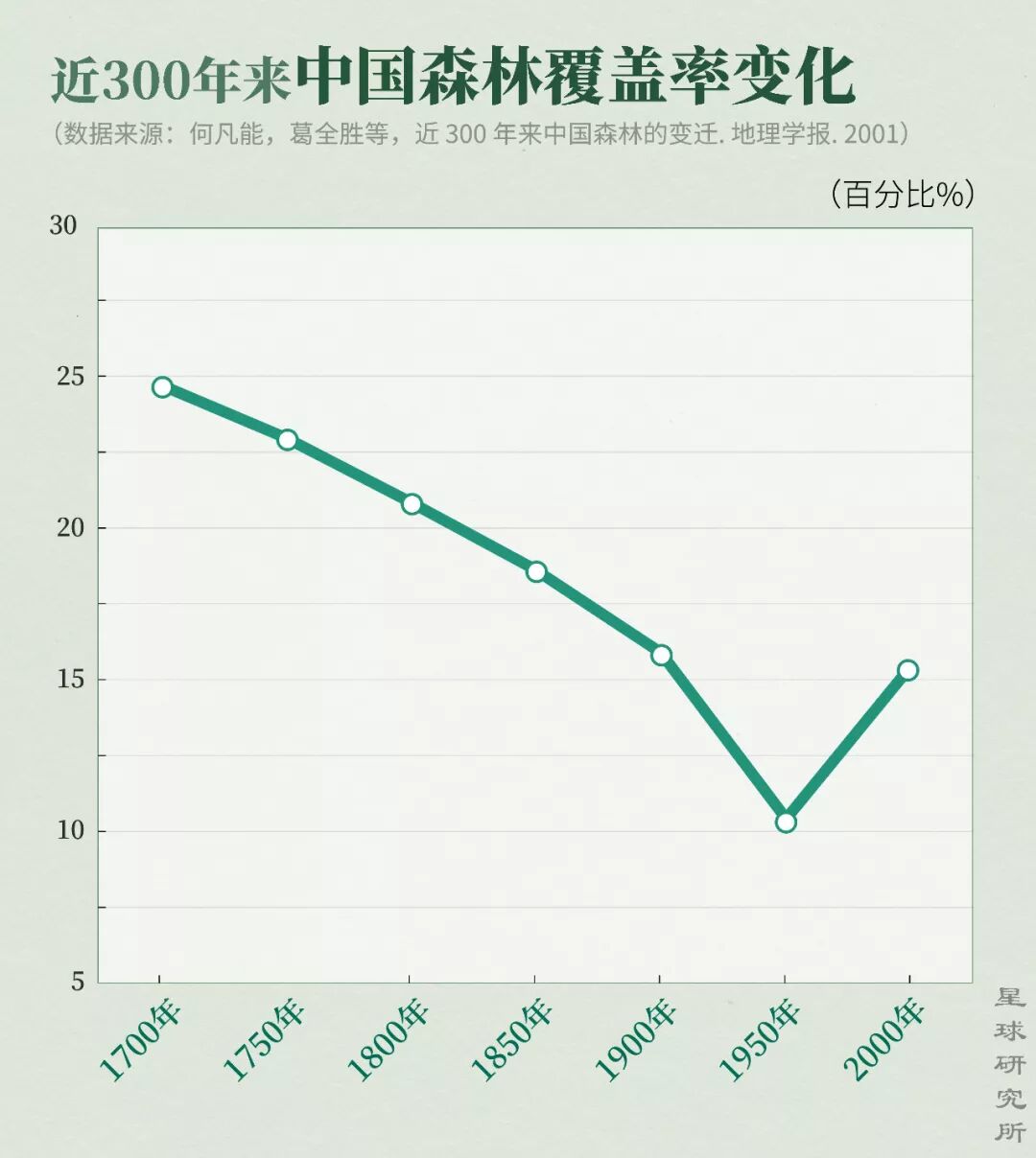 (近300年中国森林覆盖率变化趋势,制图@郑伯容/星球研究所)