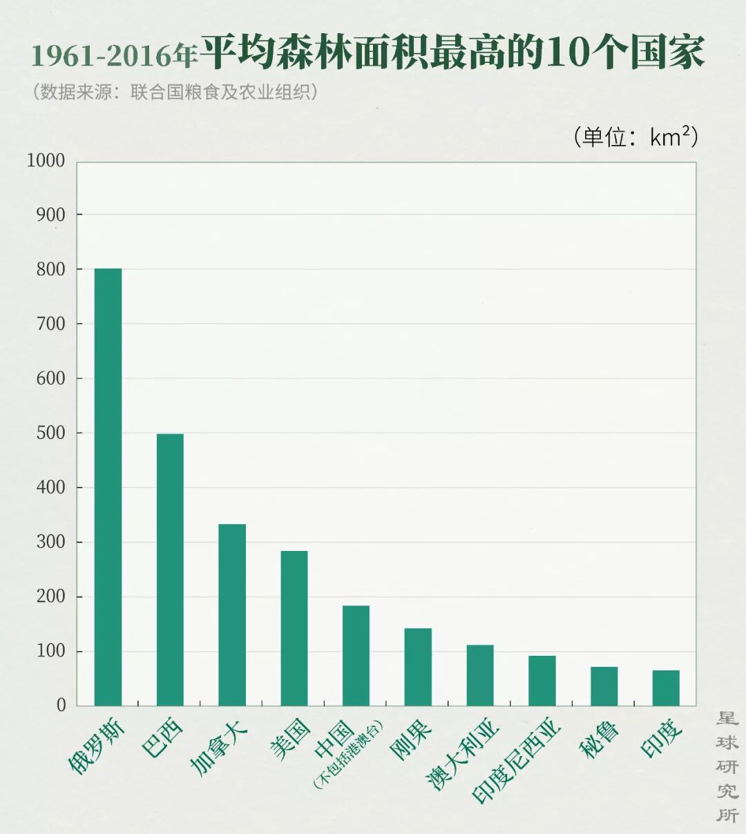 (1961-2016年世界平均森林面积最高的10个国家,数据来源于联合国粮食及农业组织,制图@郑伯容/星球研究所)