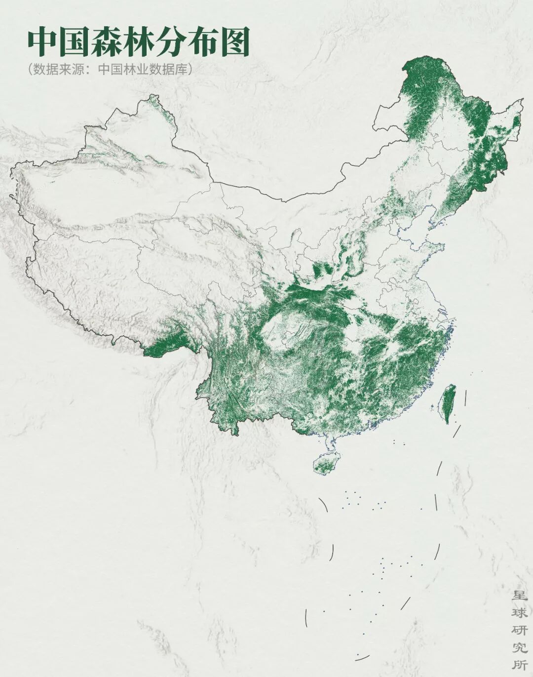 (中国森林分布图,数据来源于中国林业数据库,制图@巩向杰&郑伯容/星球研究所)