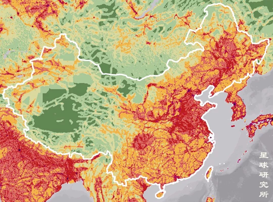 (中国人类足迹指数地图,通过城市建设、土地利用、道路分布、夜晚灯光等多个指标衡量人类对环境的影响,颜色越红表明影响越大,数据源自@ Wildlife Conservation Society/Columbia University Center for International Earth Science Information Network,制图@刘昊冰/星球研究所)