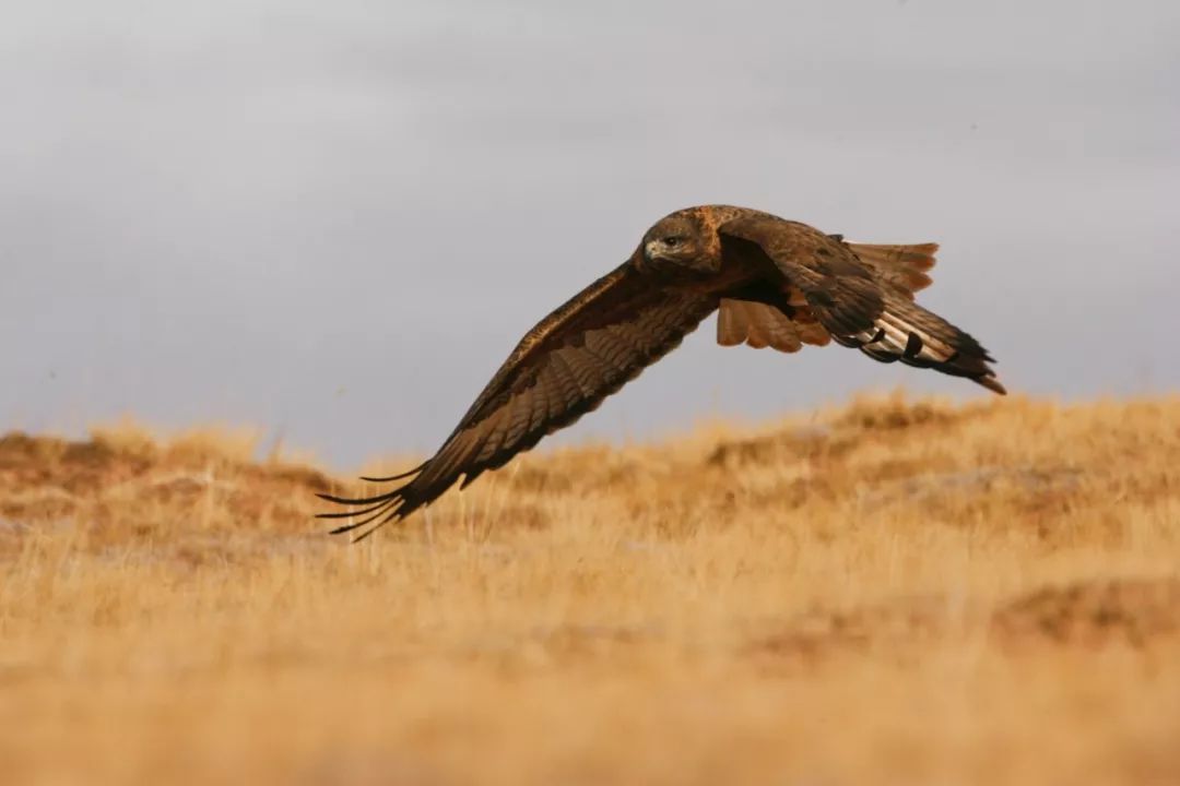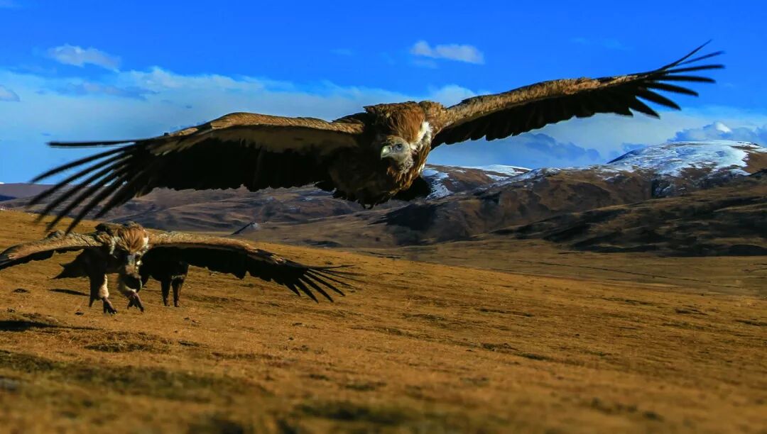 猎隼、大鵟(音kuáng)等大型猛禽从空中飞临