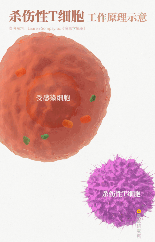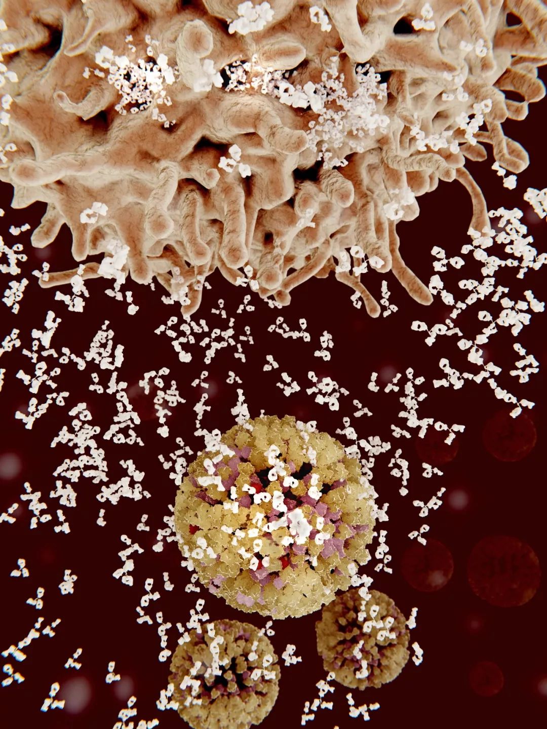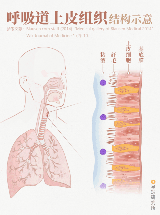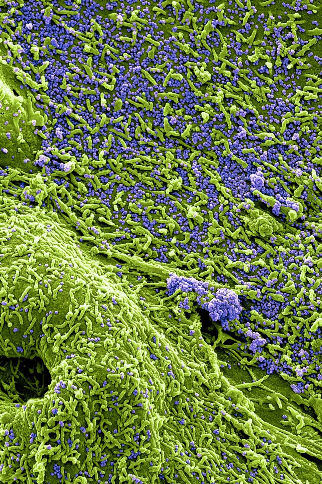 (病毒数量依据微生物学家Lita Proctor的估算;下图大量紫色颗粒为中东呼吸综合征冠状病毒,附着在绿色的细胞上,扫描电镜成像,后期着色,图片源自@NIAID)