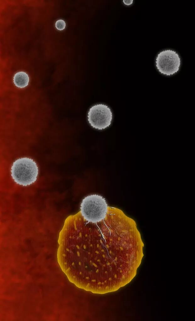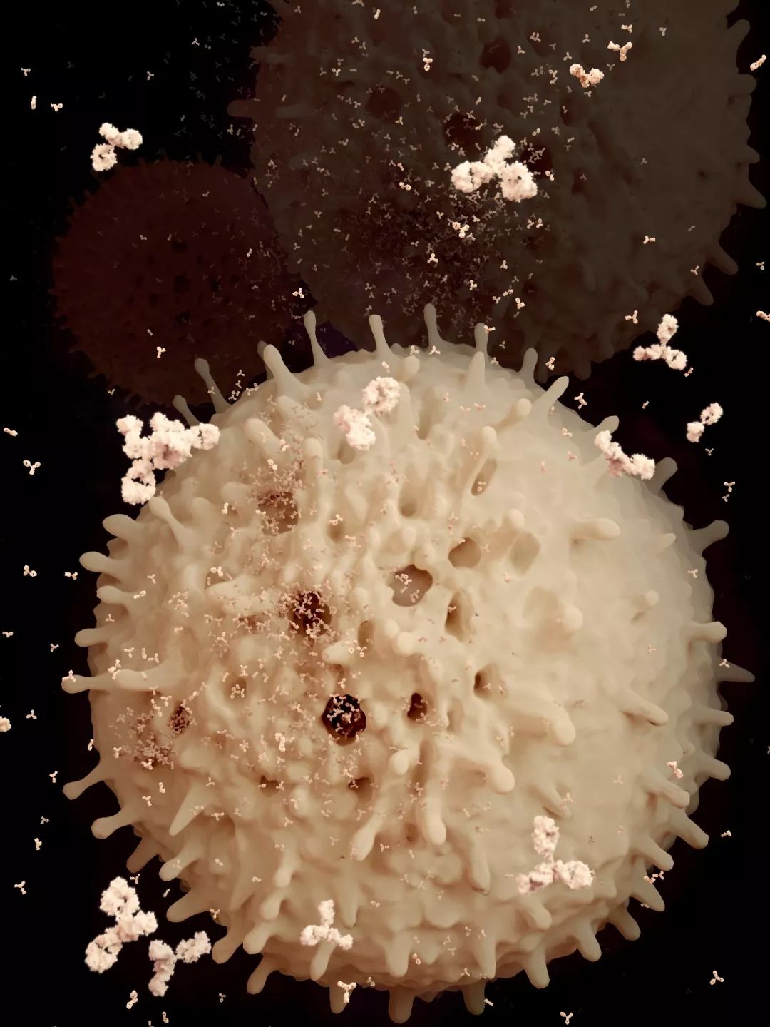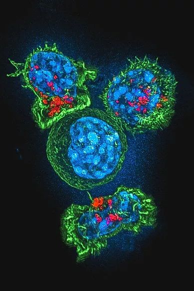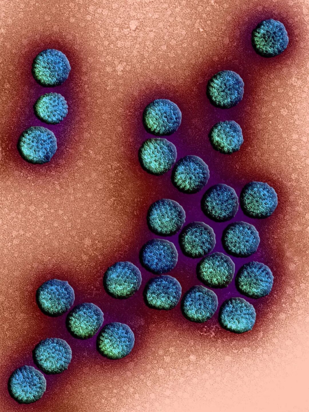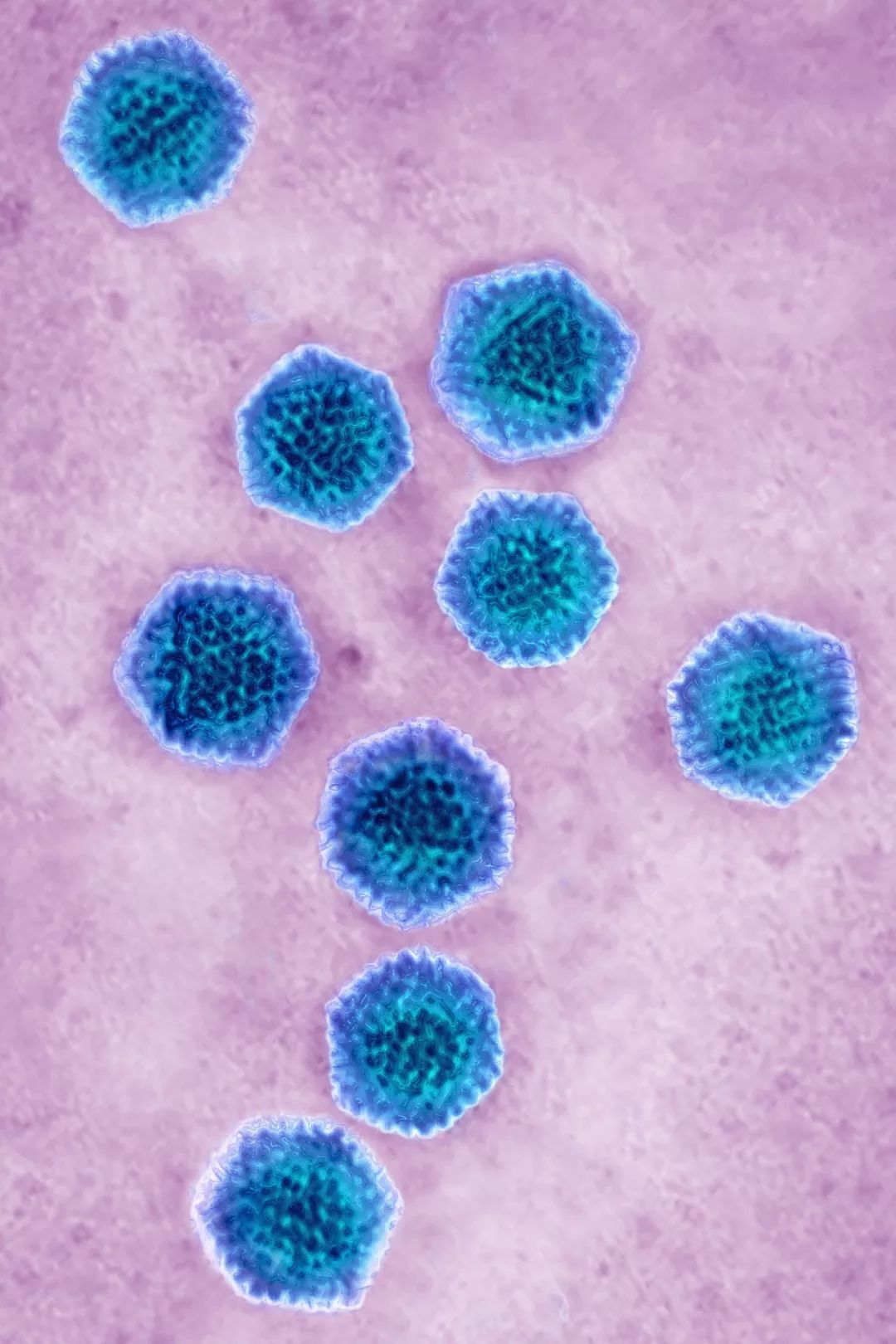 (病毒数量依据微生物学家Lita Proctor的估算;下图大量紫色颗粒为中东呼吸综合征冠状病毒,附着在绿色的细胞上,扫描电镜成像,后期着色,图片源自@NIAID)