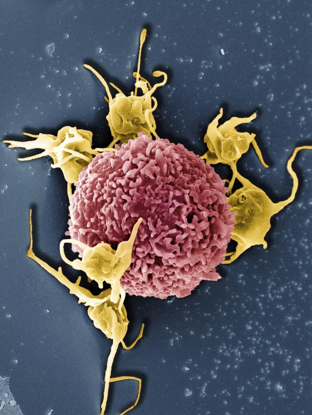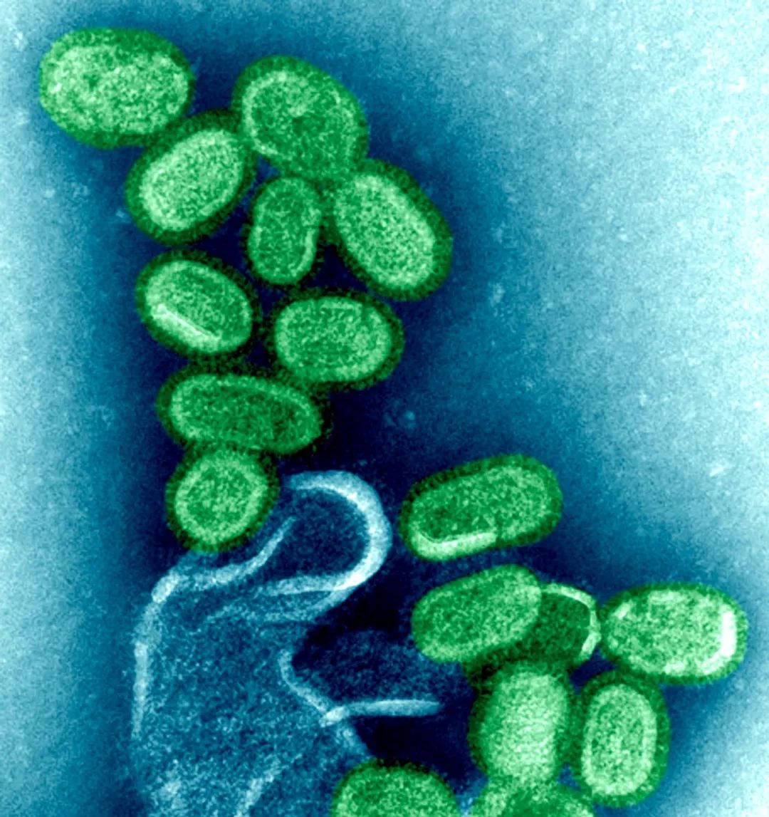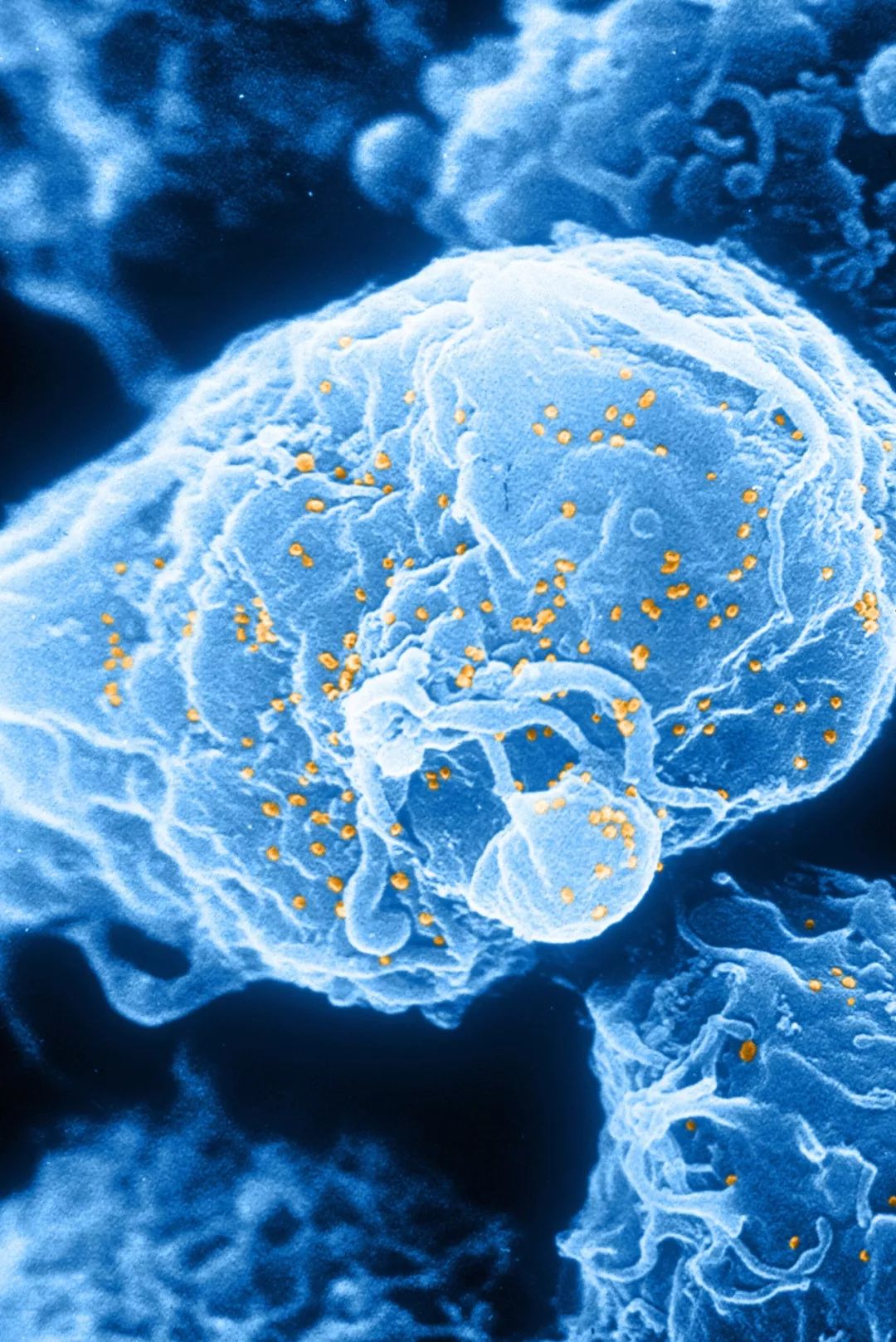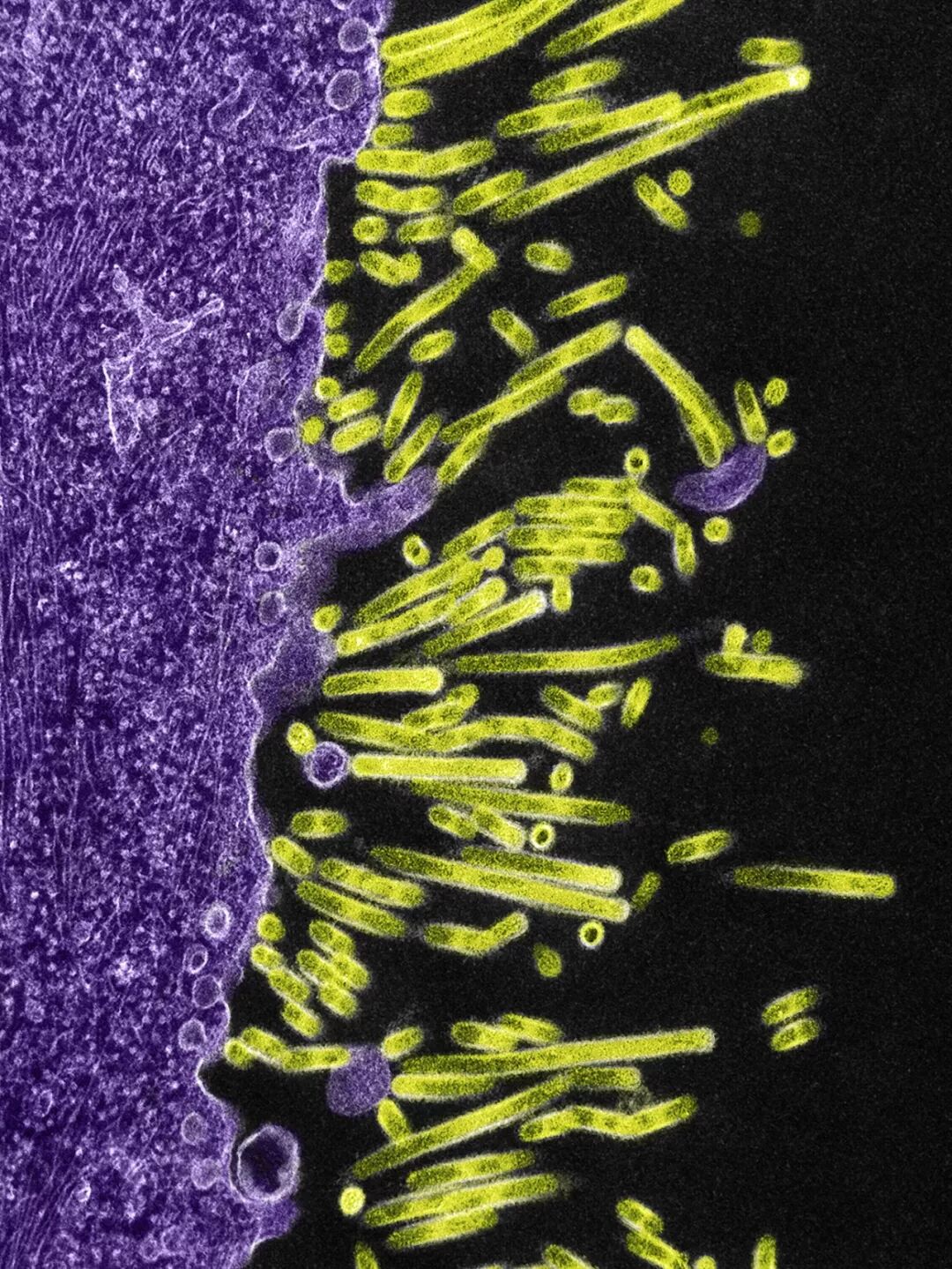 (流感病毒在细胞内完成增殖后,正从细胞表面出芽释放,黄绿色为病毒,透射电镜成像,图片源自@NIAID)