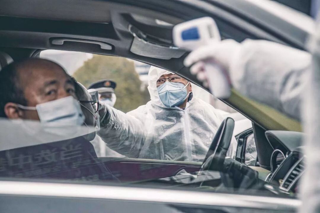 (2020年1月25日湖北G50高速黄石出口,防疫人员在测量进城人员体温,摄影师@周巍)