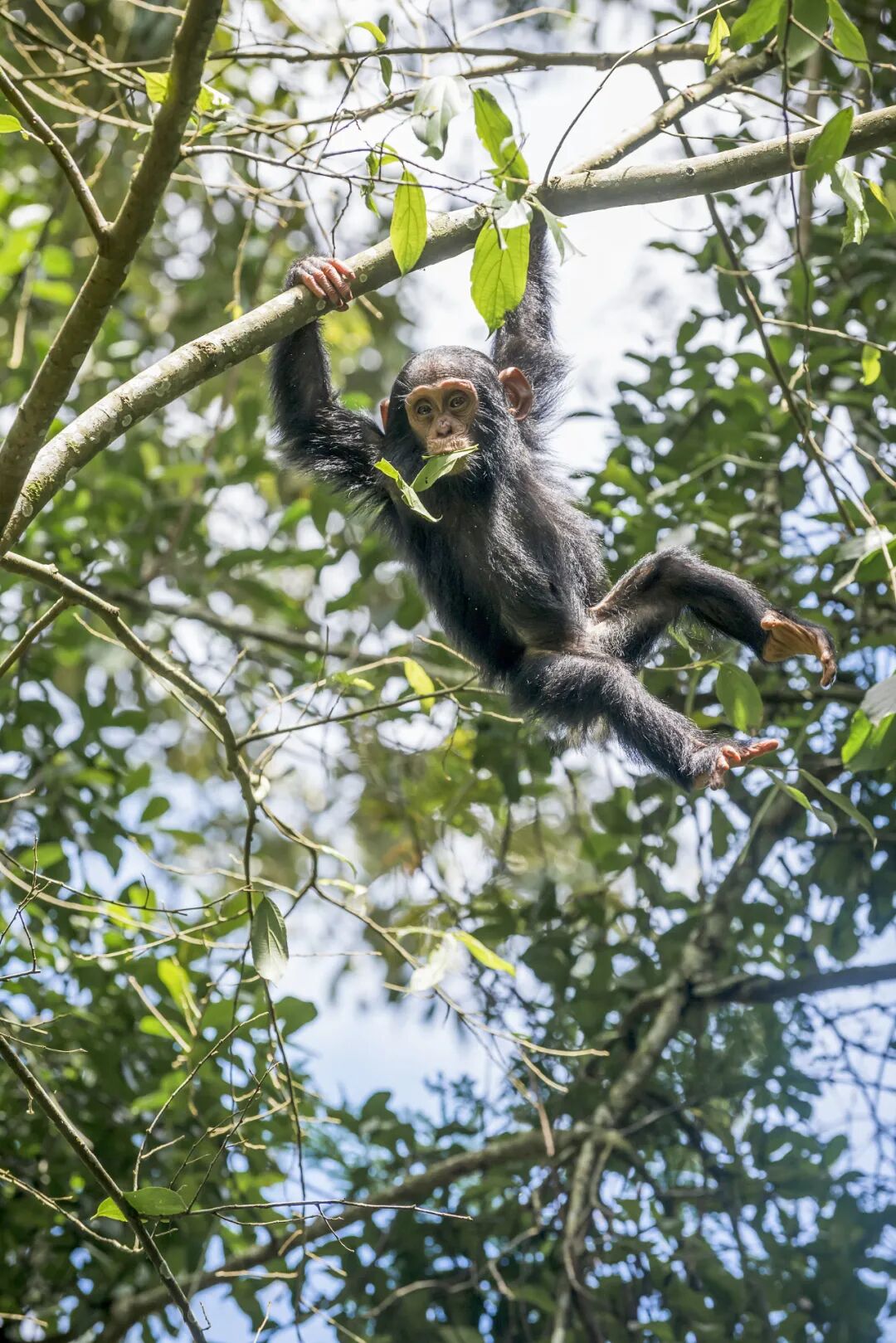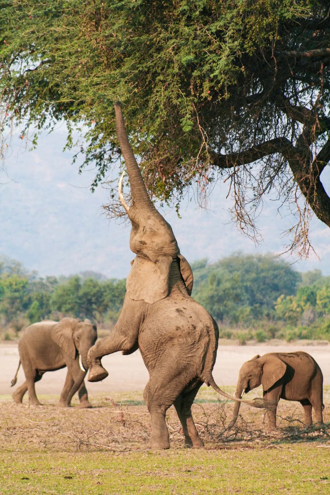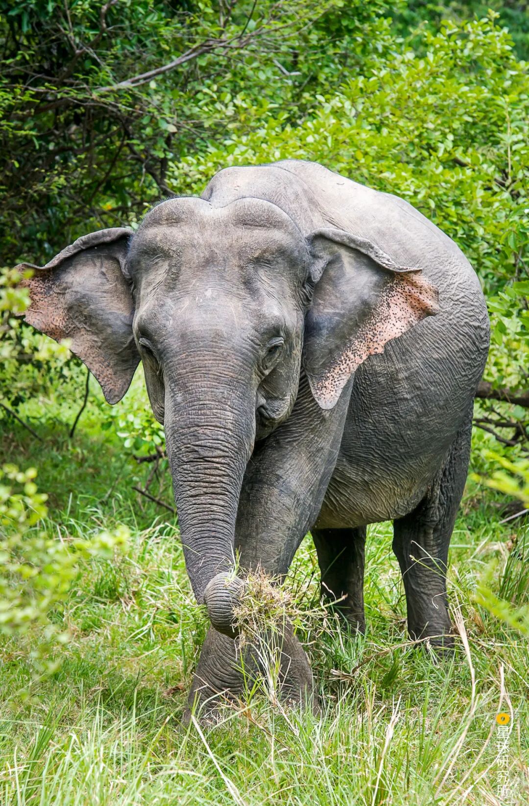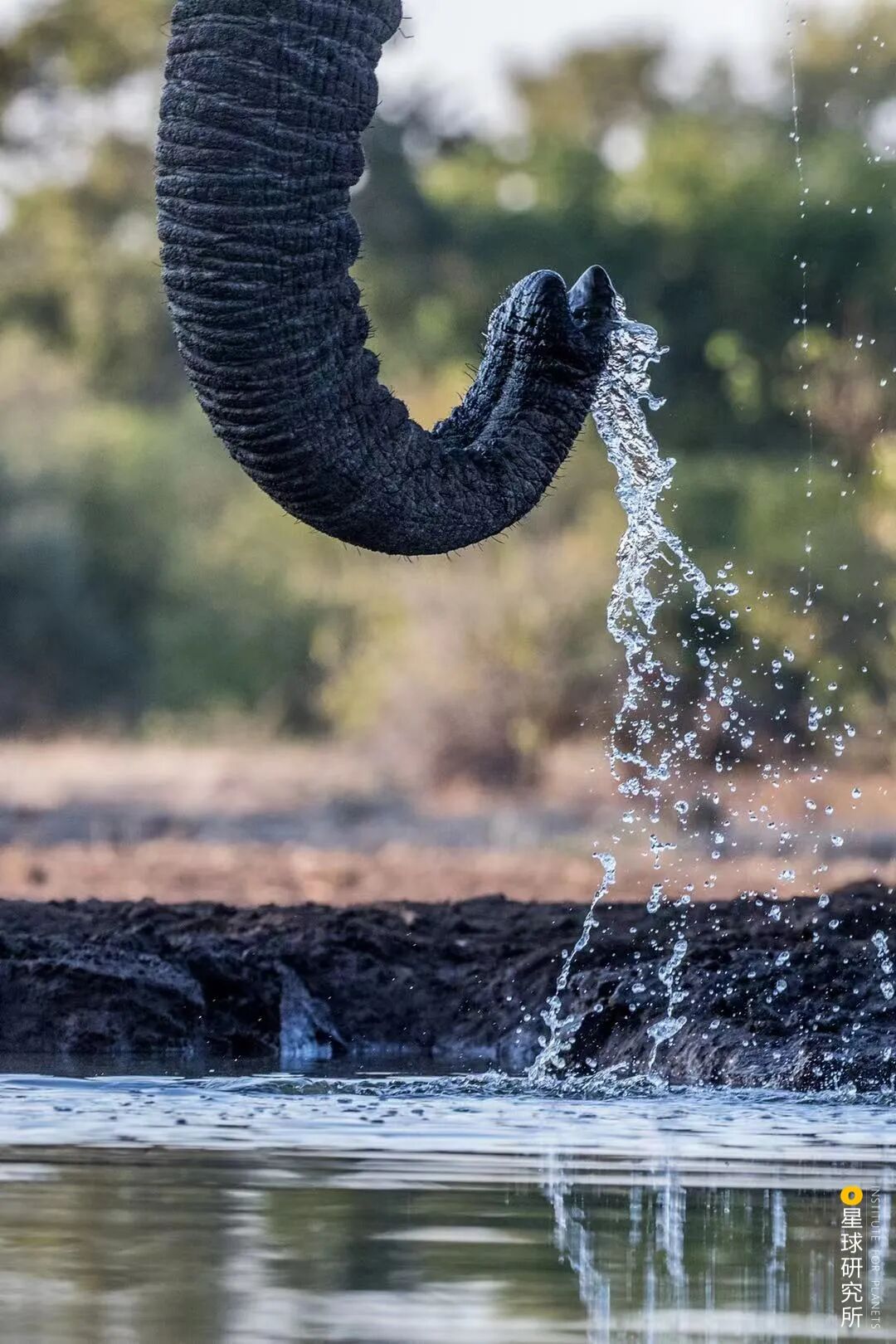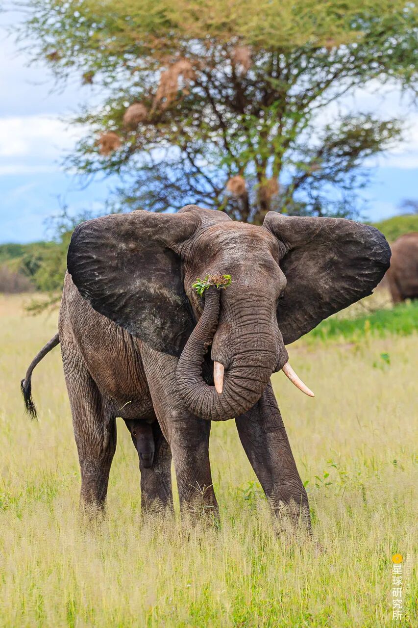 (一头年轻的非洲草原象正用鼻子抓起一把植物举到眼睛处,或许它是在用其驱赶蚊虫,摄影师@贾纪谦)