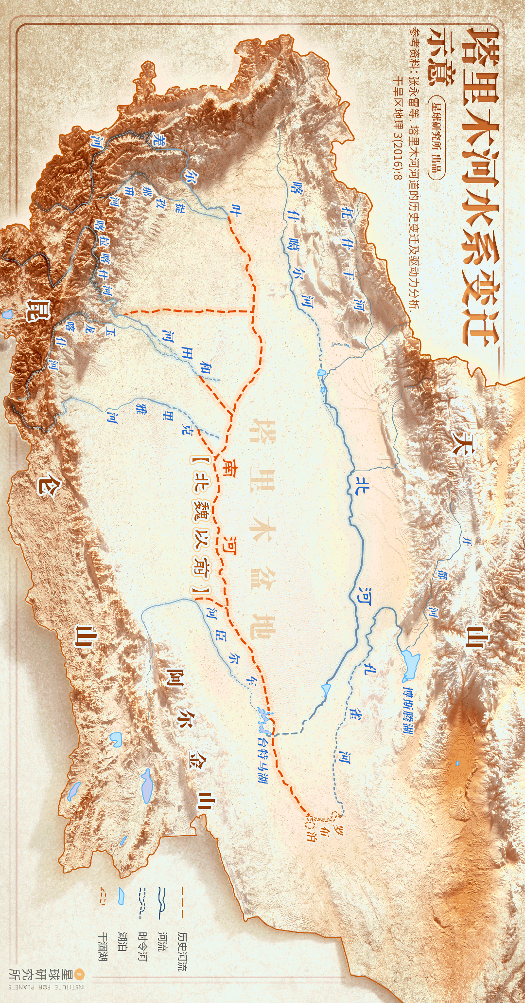 (塔里木河水系变迁示意,由于北河未有确切的变迁历史,下图选用现代河流的位置仅作示意,图片重点突出南河的变迁过程,制图@吴昕恬/星球研究所)
