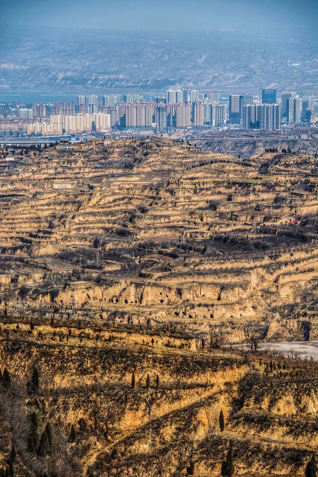 (河南三门峡附近黄土高原地貌,远处为三门峡市区与黄河,摄影师@王钰权)