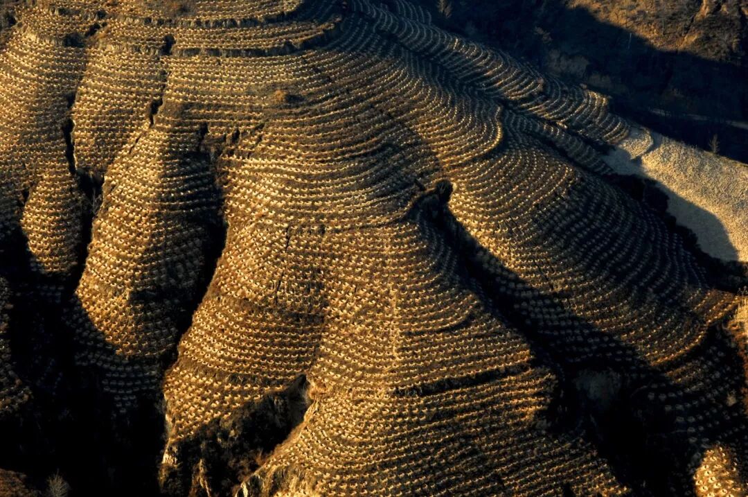 (延安市延川县的座山头布满了人工挖掘的育林坑,下雨时用于聚水,防止水土流失,来年在坑内种树育林,由于形似鱼鳞片,故也叫"鱼鳞坑",这是黄土高原常见的保持墒情、植树造林的方法;摄影师@许兆超)