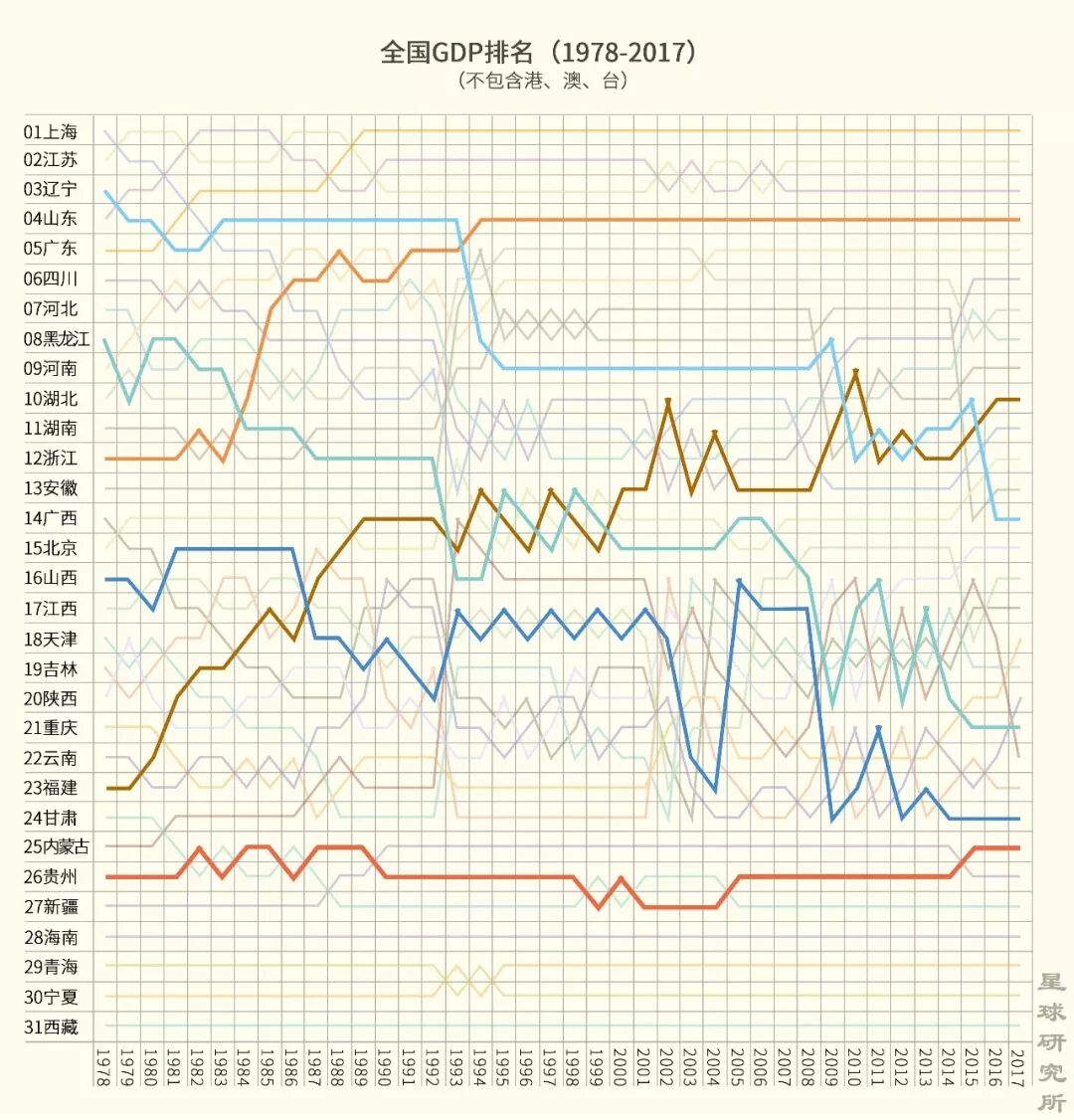(1978-2017年全国各省区GDP排名,不含香港、澳门、台湾,数据来源国家统计局及各省统计年鉴,制图@张靖/星球研究所)