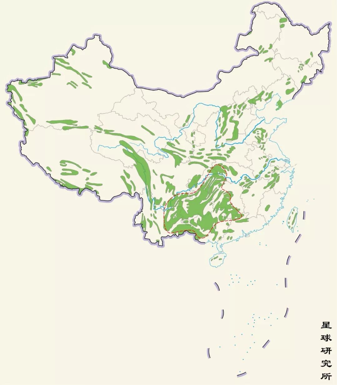 (中国碳酸盐岩分布图,红线内为密集区域,制图@王朝阳/星球研究所,参考《中国自然地理图集》)