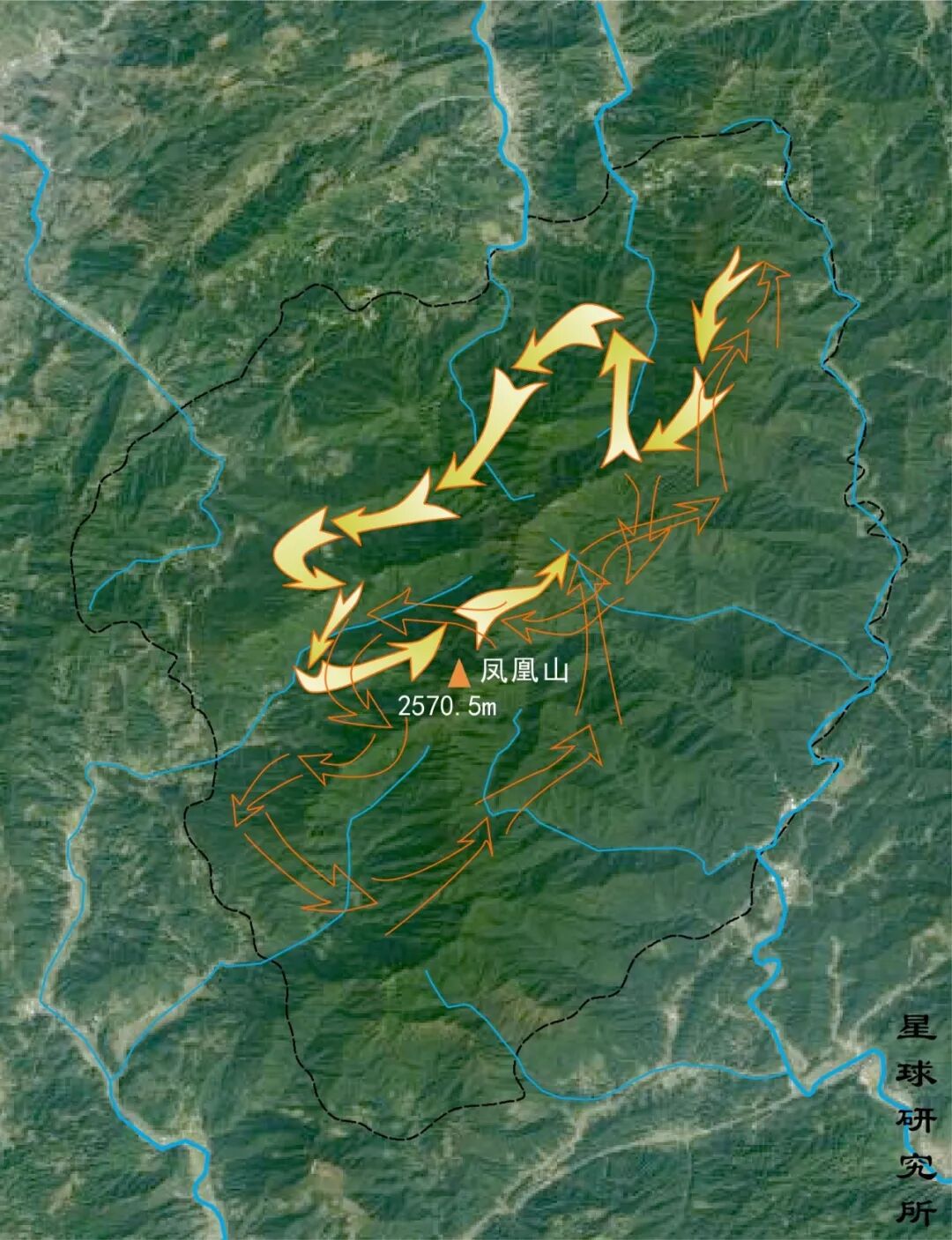 (黔金丝猴大群体活动线路图,制图@王朝阳/星球研究所,依据@杨业勤等《梵净山研究:黔金丝猴的野外生态》)