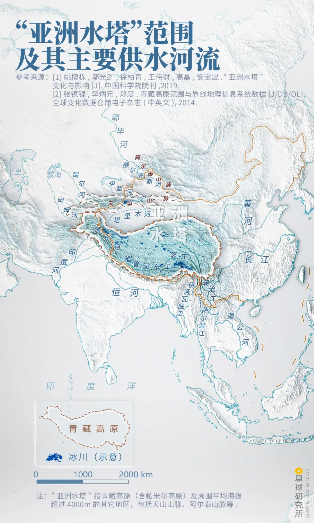 (“亚洲水塔”范围及其主要供水河流示意,“亚洲水塔”指代青藏高原及其周边高山地区,制图@陈志浩/星球研究所)