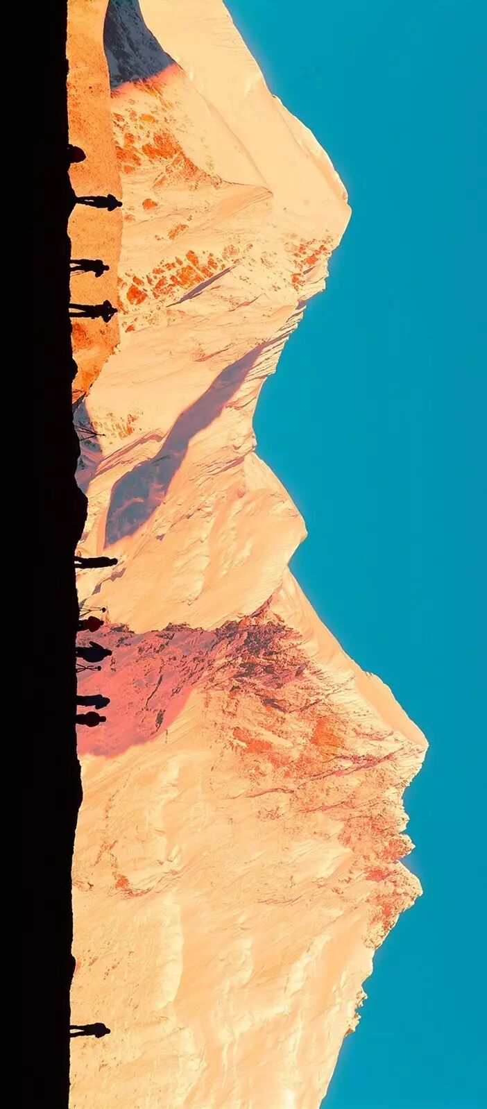 (请将手机横屏观看,拍摄于早晨7点30分左右;为了画面的纯净,我们未在图中进行山峰标注,请自行识别:被点亮的山峰从左至右分别是马卡鲁峰、珠穆朗卓峰、珠穆朗卓中峰、洛子峰、珠穆朗玛峰;摄影师@田忠智)