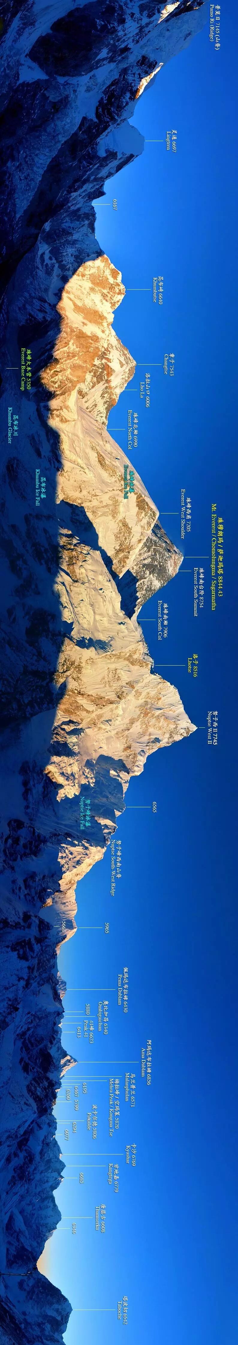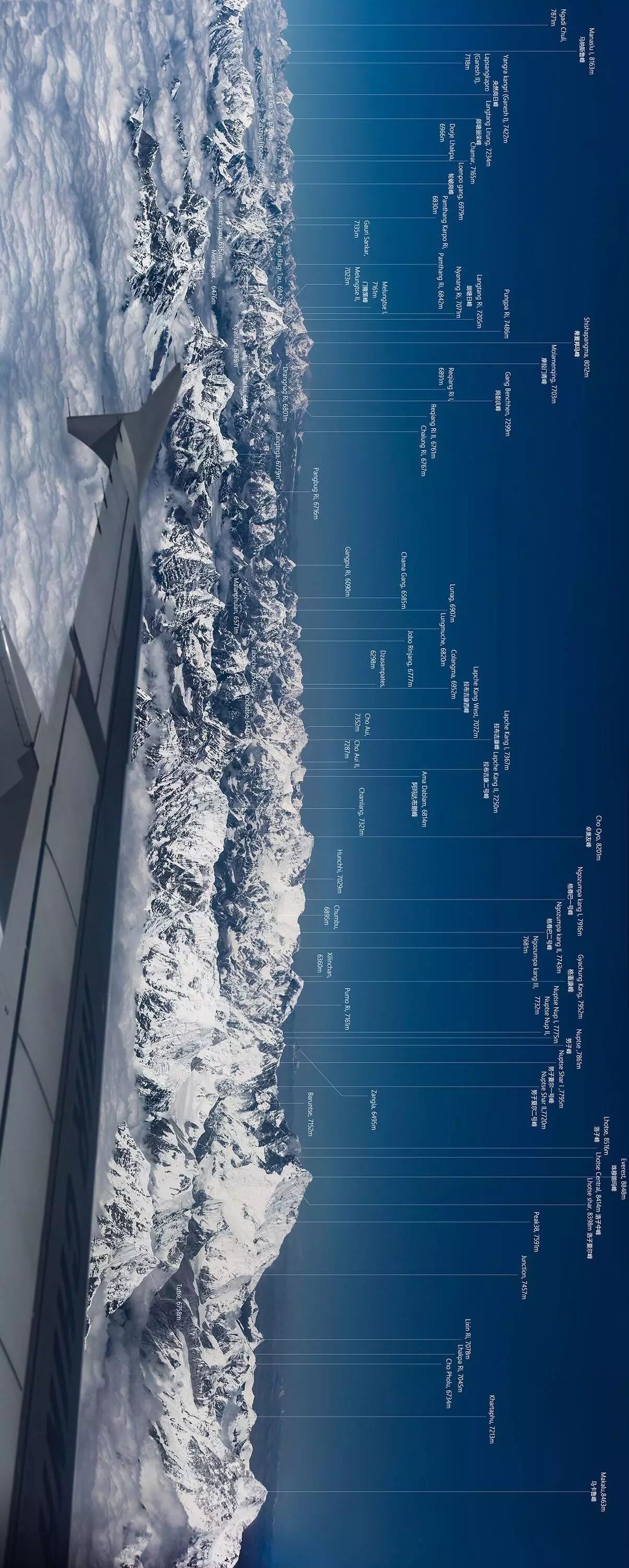 (环珠峰景观群的主要山峰,可点击放大后横屏观看,此图山峰清晰锐利,堪称神图,画面囊括的范围比我们定义的环珠峰景观群要略大;拍摄于加德满都飞往拉萨的国航航班;摄影师及山峰标注@曲子华)