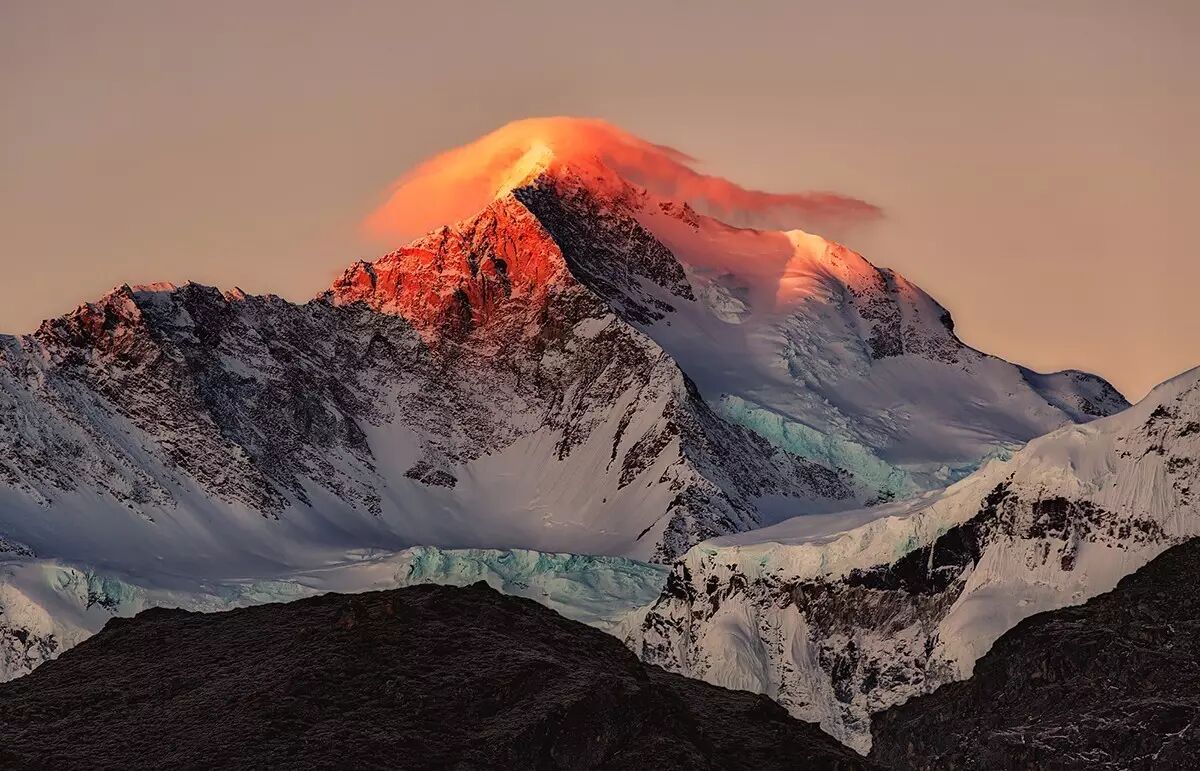(在小乌措附近拍摄的马卡鲁峰,火烧帽子云,摄影师@周游)