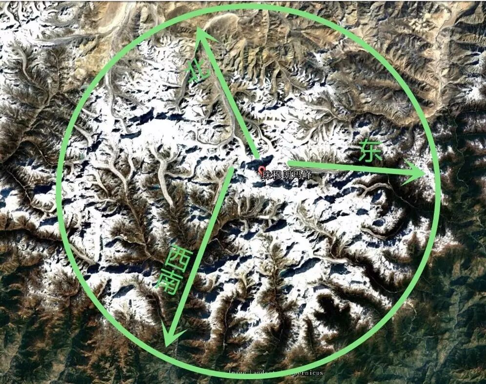 (珠峰的地形图,星球研究所基于Google地球制作;西南部珠峰南坡对应昆布冰川;北部珠峰北坡对应绒布冰川;东部珠峰东坡对应康雄冰川)