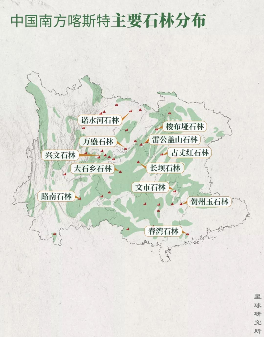 (中国南方喀斯特区域主要石林分布,制图@郑伯容&巩向杰/星球研究所)