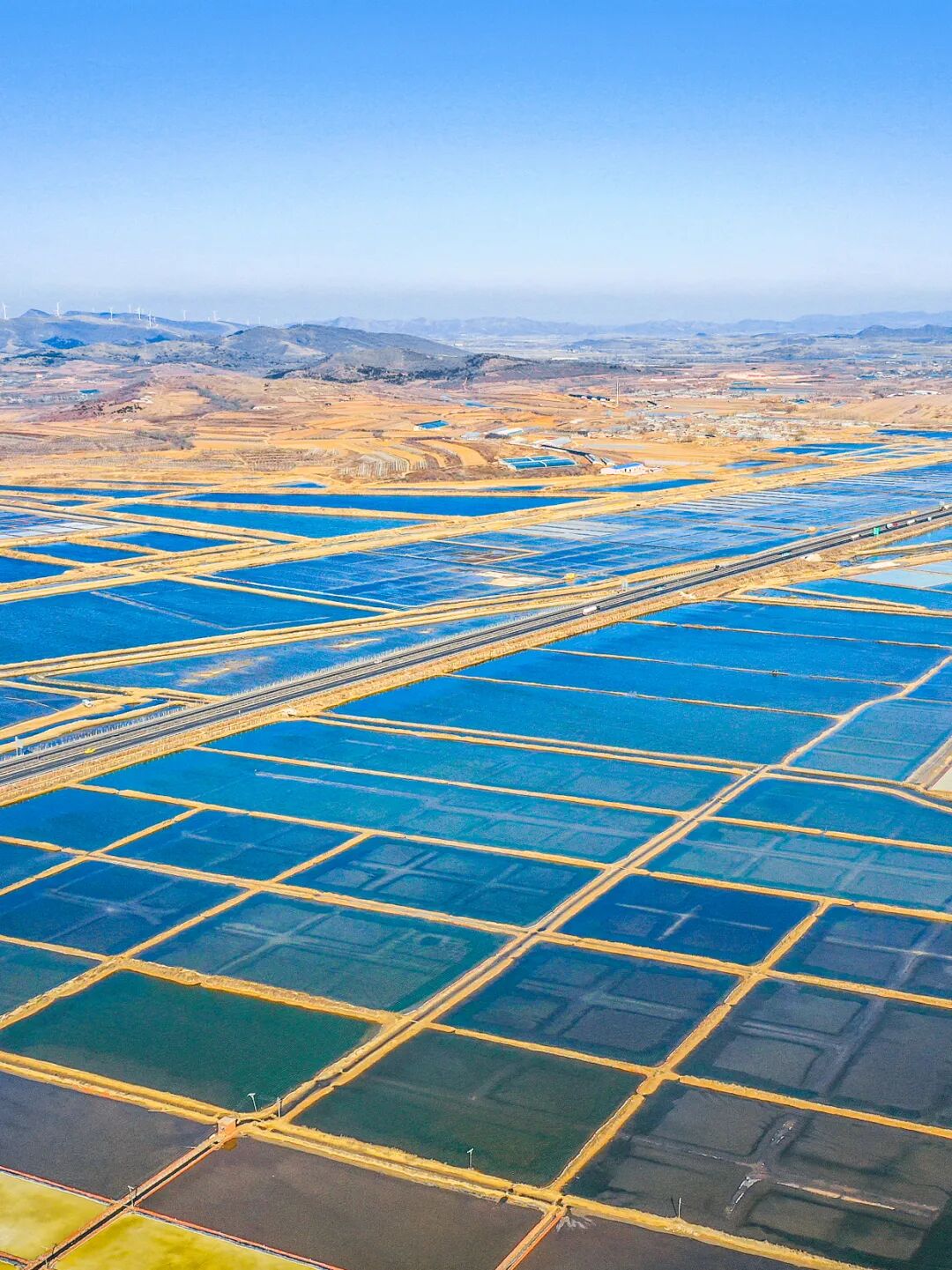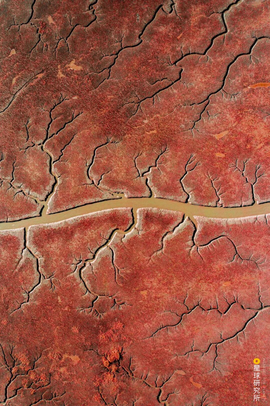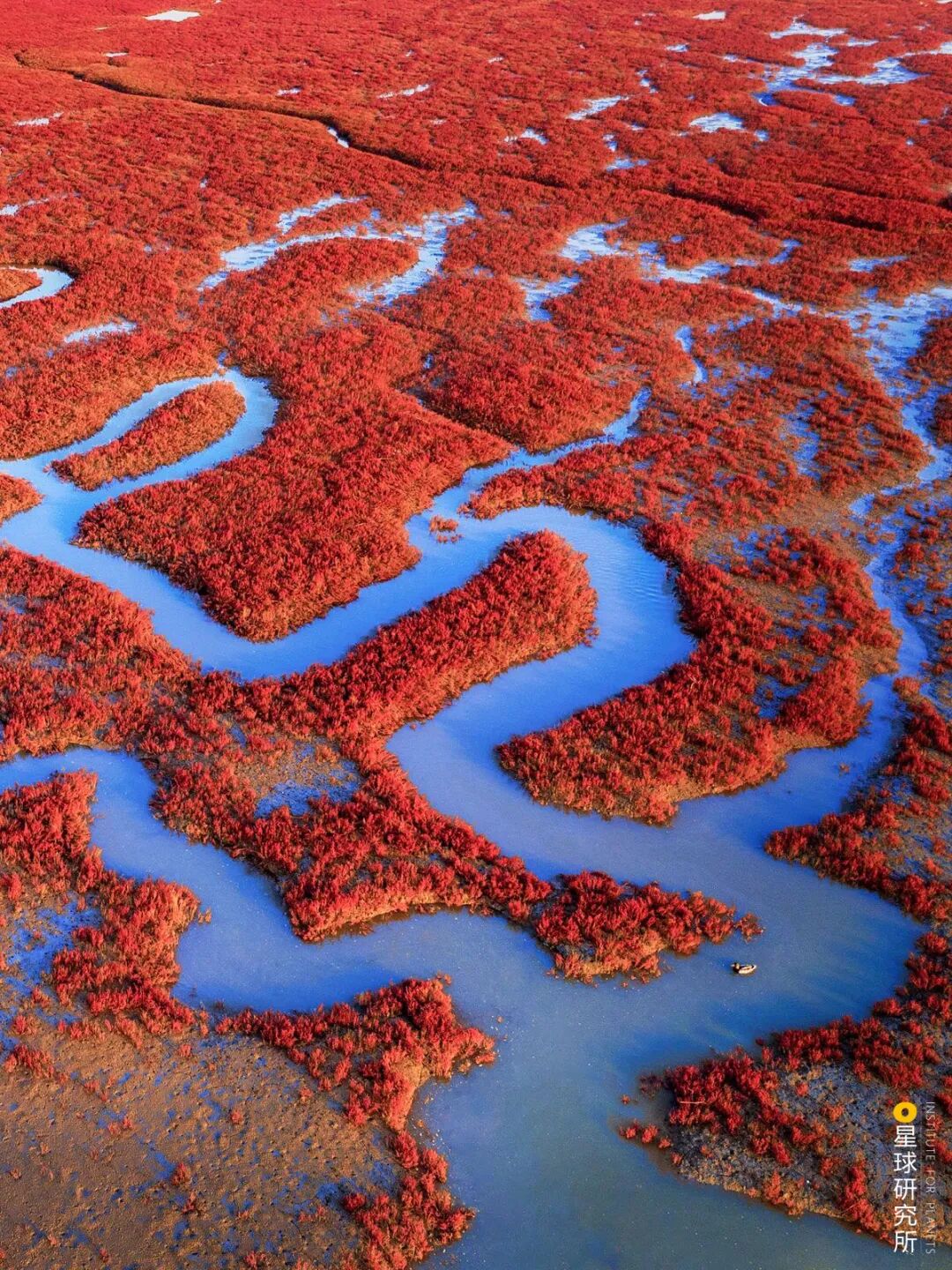 (航拍秋季的辽宁盘锦红海滩,红色的是以碱蓬草为代表的沿海耐盐碱滩涂植被,摄影师@颜景龙)