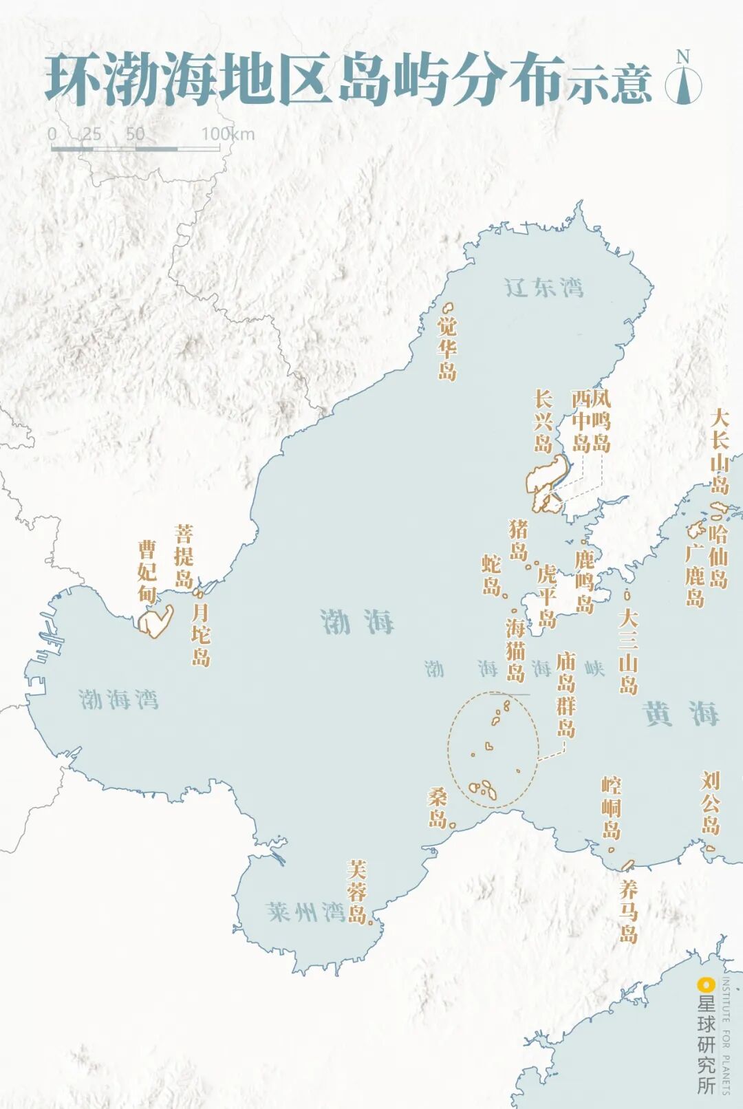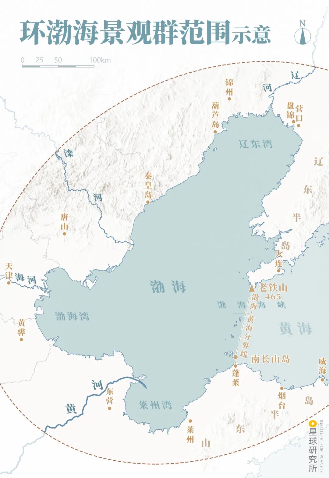 (环渤海景观群范围示意,以渤海海域为核心,同时也包含辽东半岛东部、山东半岛东北部紧邻黄渤海分界线的部分黄海景观,制图@陈志浩&郑伯容/星球研究所)