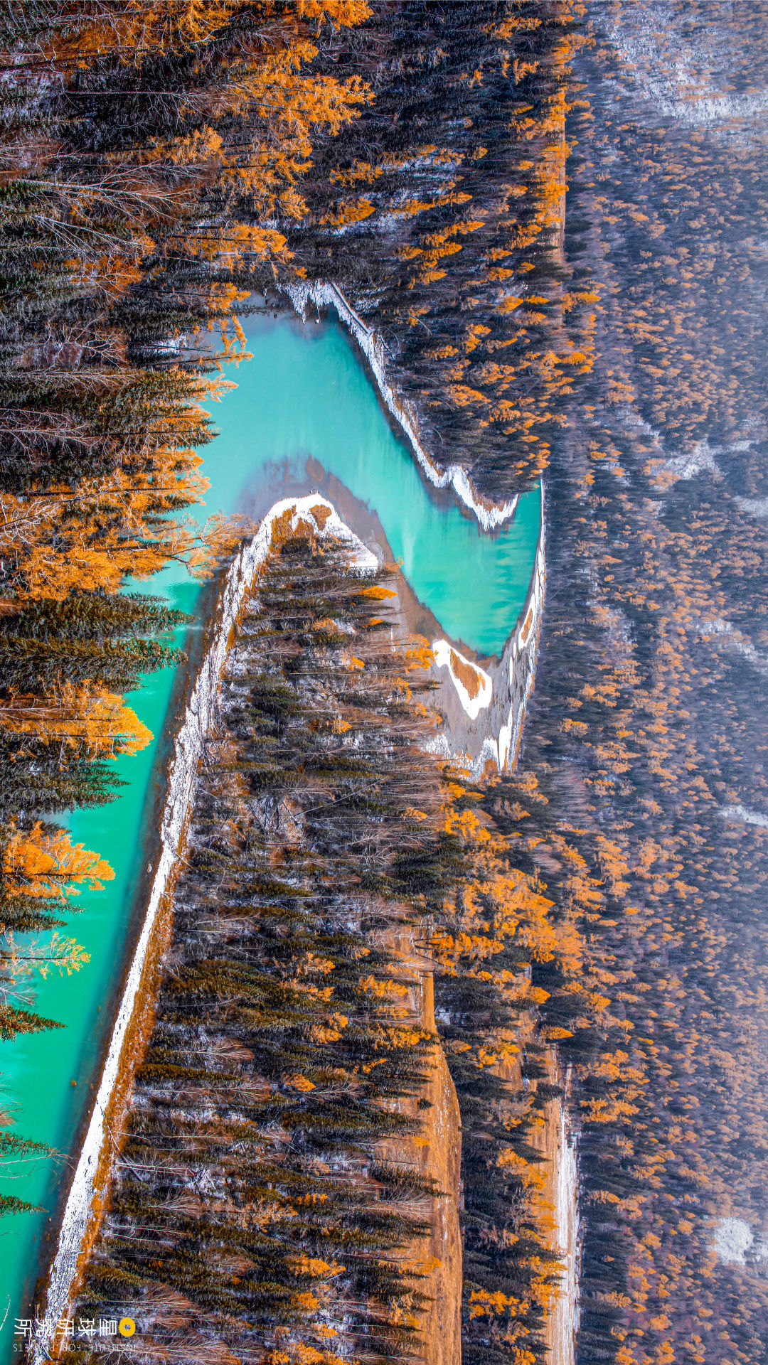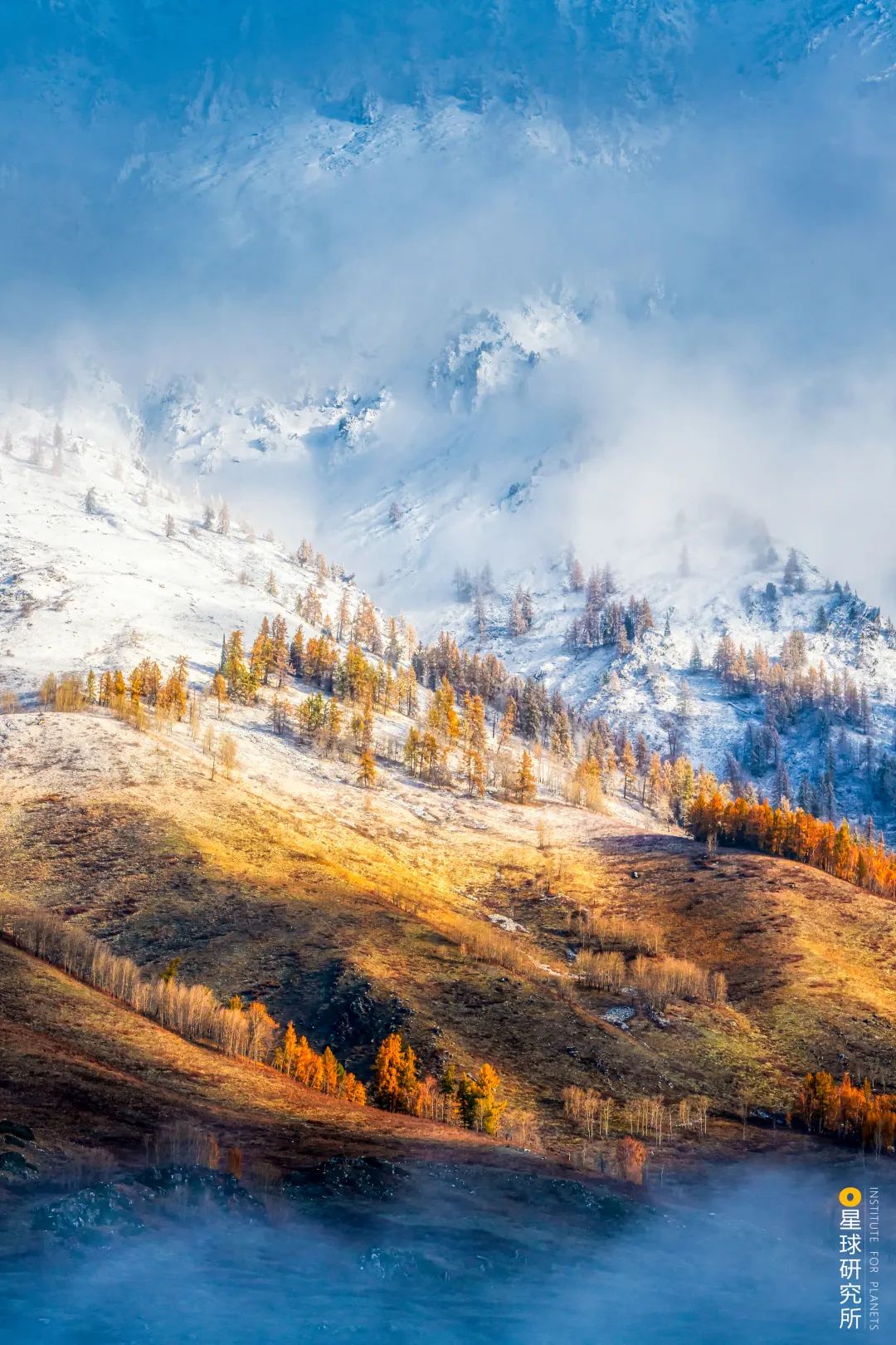 (请横屏观看,秋天雪后的喀纳斯河月亮湾,摄影师@冯光柳)