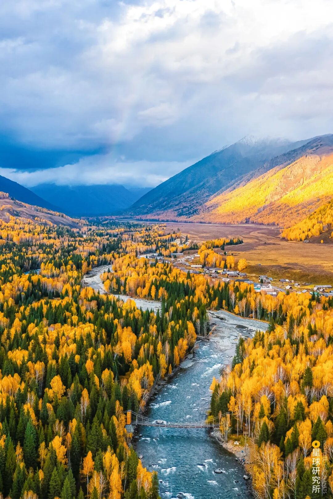 (秋季的喀纳斯禾木河与禾木新村,摄影师@焦潇翔)